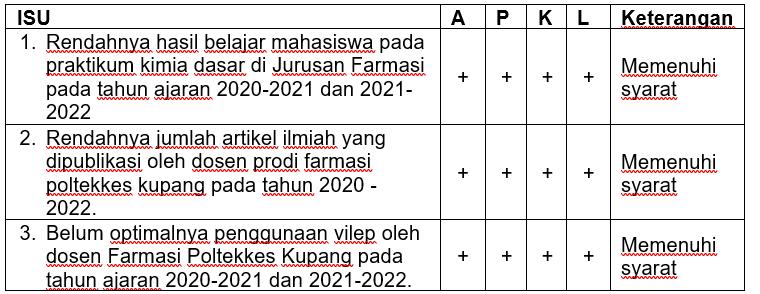 jumlah artikel ilmiah yang dipublikasi oleh dosen Prodi D-III Farmasi Poltekkes Kupang pada tahun 2020-2022, dan Isu yang terakhir adalah belum optimalnya penggunaan vilep oleh dosen Prodi D-III Farmasi Poltekkes Kupang pada tahun ajaran 2020-2021 dan 2021-2022. Tiga isu yang ditemukan ini kemudian dianalisis menggunakan teknik APKL untuk