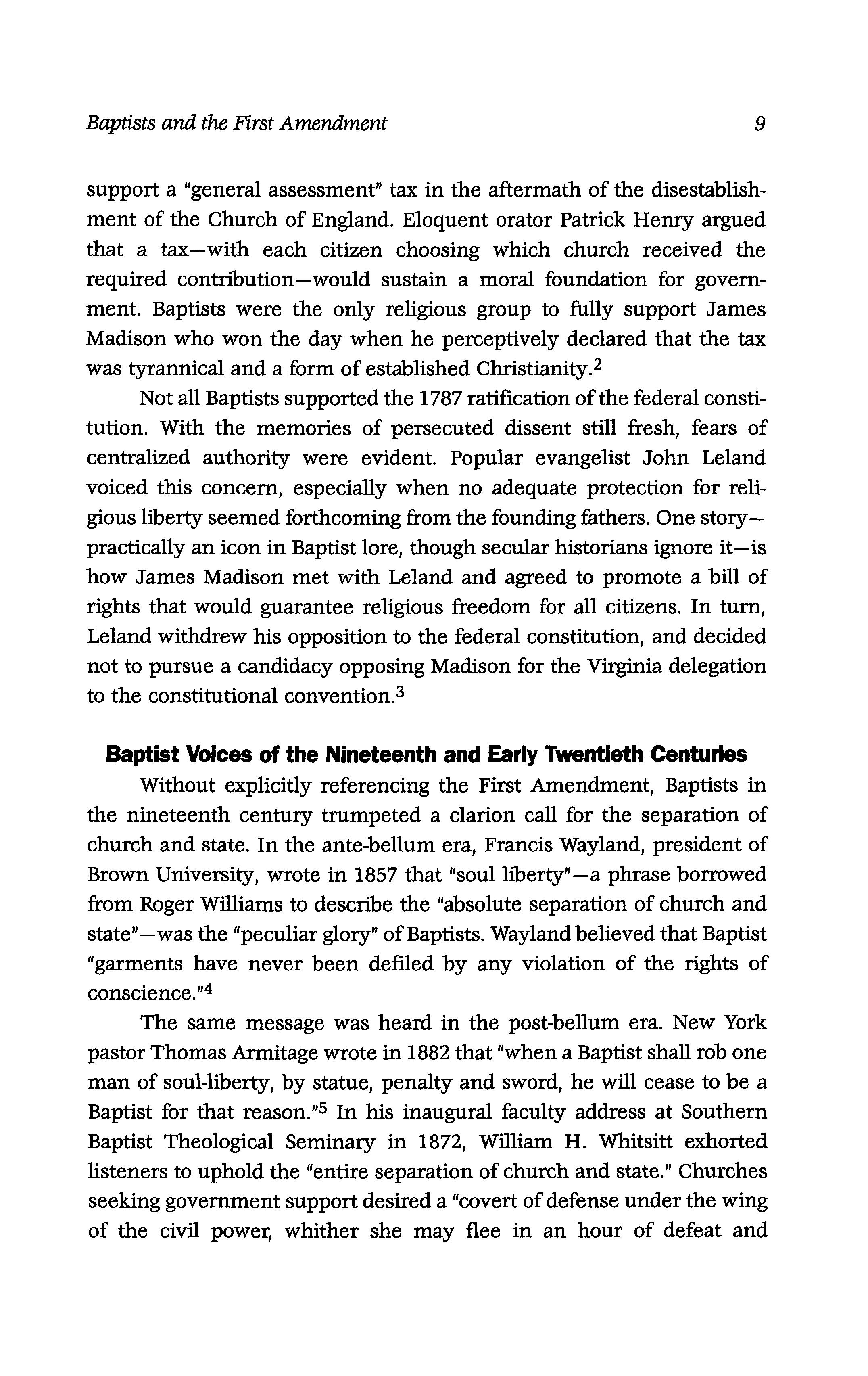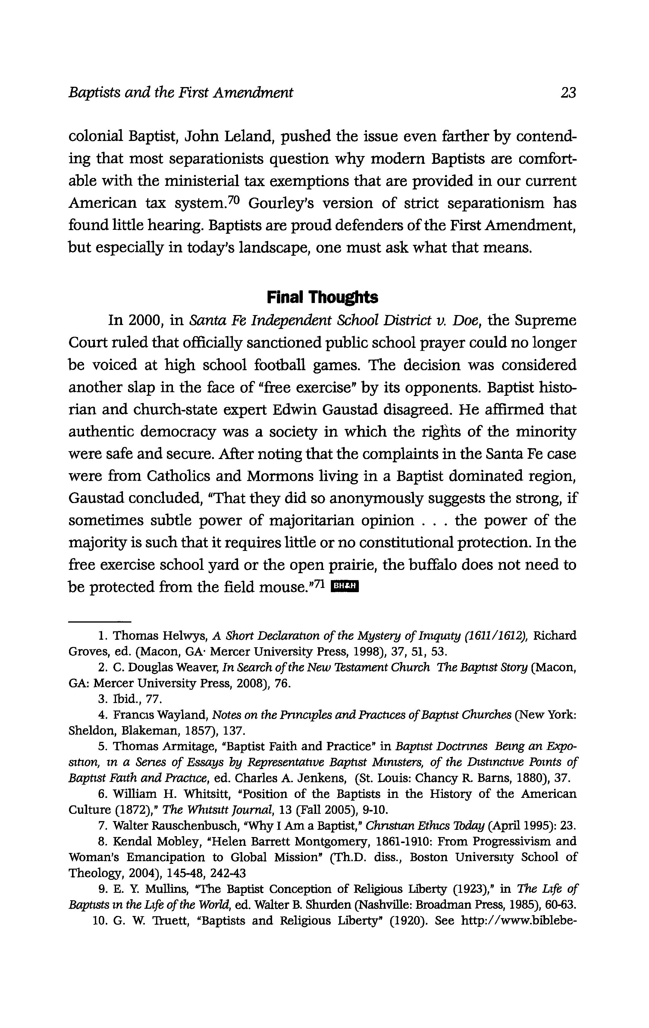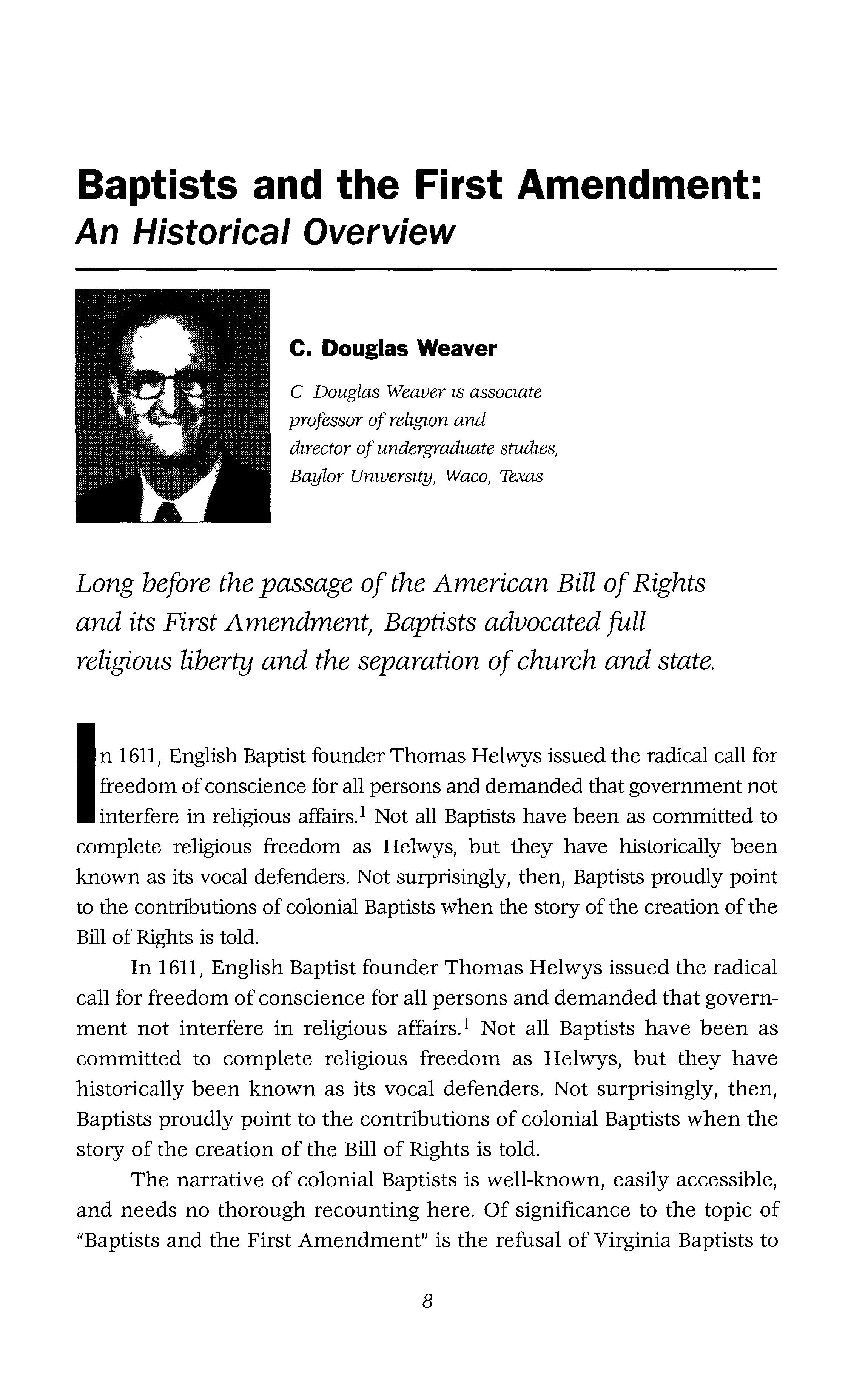 "Baptists and the First Amendment: An Historical Overview" by C. Douglas Weaver explores the historical relationship between Baptists and the principles of religious liberty and the separation of church and state, particularly in the context of the First Amendment. Weaver highlights the role of early Baptists like Thomas Helwys, who called for freedom of conscience and non-interference by the government in religious matters. The article discusses key moments in Baptist history, such as the resistance to a tax for religious support and the influence of Baptist leaders on First Amendment rights, while emphasizing their longstanding commitment to religious freedom for all.
