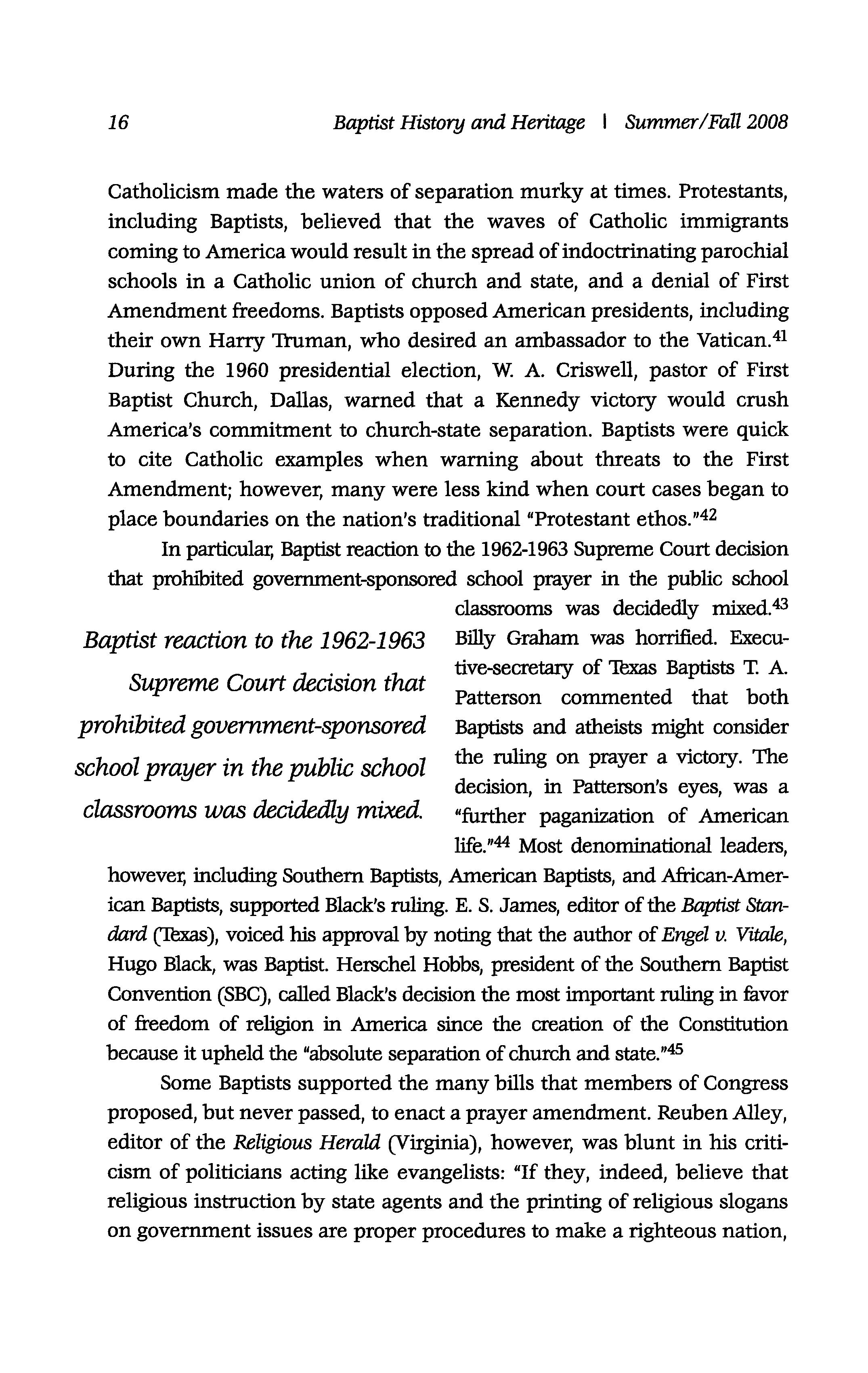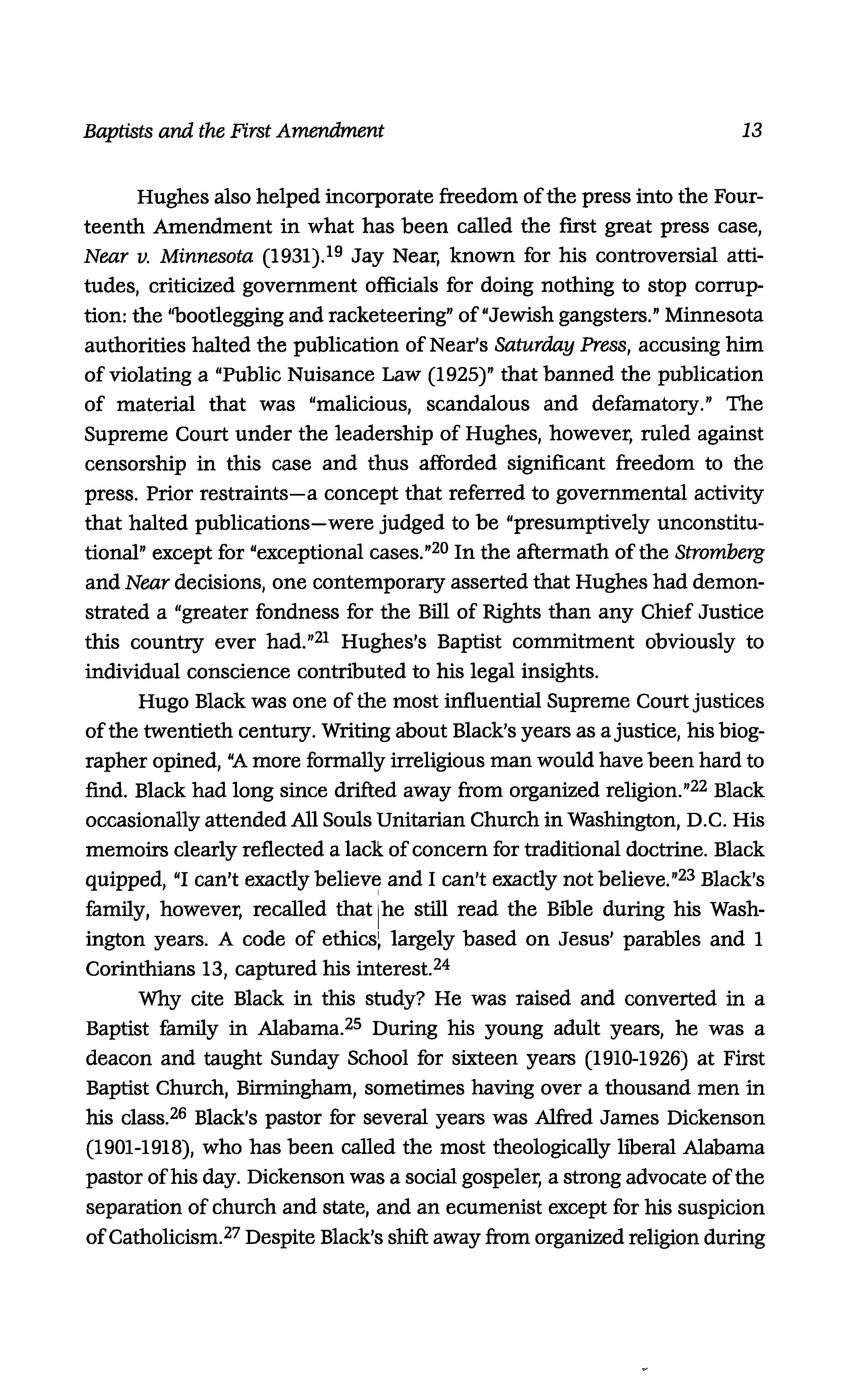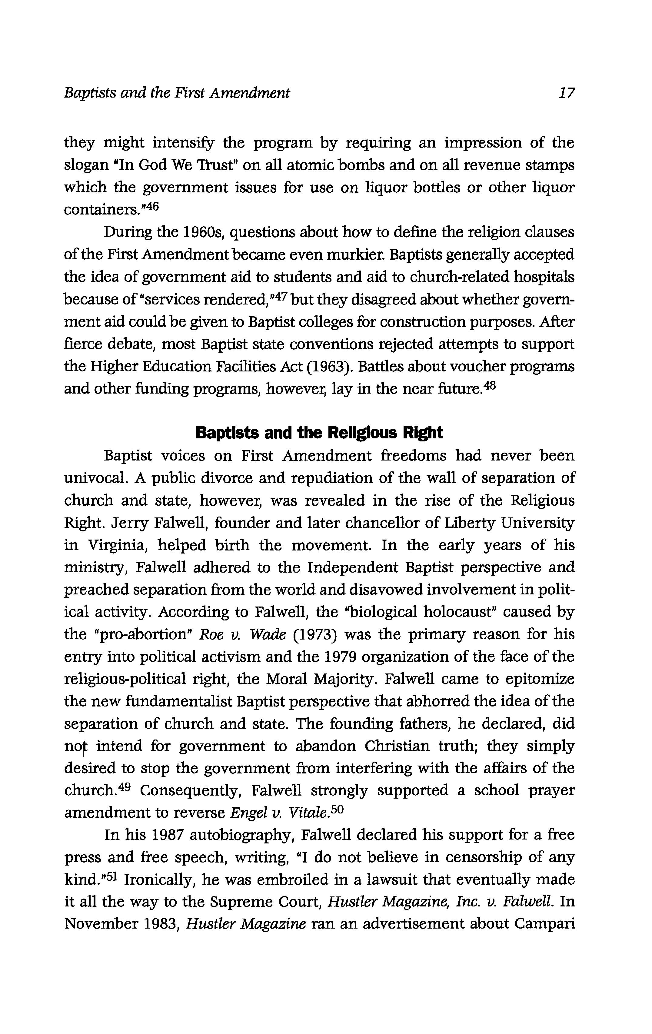 "Baptists and the First Amendment: An Historical Overview" by C. Douglas Weaver explores the historical relationship between Baptists and the principles of religious liberty and the separation of church and state, particularly in the context of the First Amendment. Weaver highlights the role of early Baptists like Thomas Helwys, who called for freedom of conscience and non-interference by the government in religious matters. The article discusses key moments in Baptist history, such as the resistance to a tax for religious support and the influence of Baptist leaders on First Amendment rights, while emphasizing their longstanding commitment to religious freedom for all.