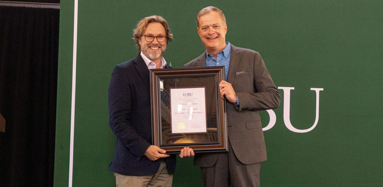 Oklahoma Baptist University (OBU) President, Heath A. Thomas presented the Herschel H. Hobbs Award for Distinguished Denominational Service to Stephen Rummage on June 11 during the Southern Baptist Convention Annual Meeting in Indianapolis. Rummage serves as senior pastor of Oklahoma City, Quail Springs. “I am so pleased that the committee unanimously selected Rummage for this prestigious award,” Thomas said. “In the tradition of Herschel Hobbs, Rummage is a pastor, churchman, scholar, and denominational leader. We are grateful to have him serving faithfully in Oklahoma and leading graciously in the national convention.” Rummage also has pastored churches in Florida, North Carolina, Virginia, and Louisiana. He has taught at Southeastern, New Orleans and Midwestern seminaries. Rummage is also an author and the founder of Moving Forward, a nationally broadcast radio teaching ministry. He served as president of the 2024 SBC Pastors’ Conference and has previously held positions, including chairman of the SBC Executive Committee and president of the Florida Baptist Convention.
