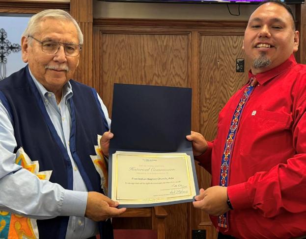 On Sat., March 7, Ada, First Indian celebrated their 75 year anniversary. Oklahoma Baptists Native American ministry partner Emerson Falls presented the church with a certificate in recognition of this milestone. “The Lord has brought us a long way from our start as a mission under Ada First Baptist in 1951,” the church wrote in a Facebook post. “We are grateful for the blessings we have received over the years and look forward to the Lord’s plans for us in the next 75 years.”