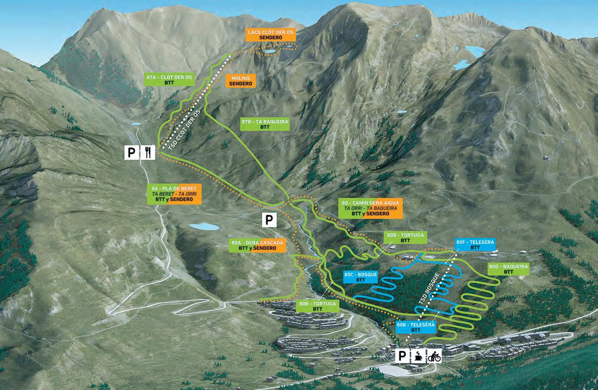 propuesta bien diseñada y accesible para todos los públicos. “El telesilla del Bosque y Clot der Os dan acceso a zonas de BTT como una pista muy divertida, un flowtrail bastante largo que puede disfrutar cualquier tipo de persona desde Clot der Os, incluso niños. La zona del Bosque es más exigente y divertida, con peraltes y saltos”, explica Moga, que valora especialmente la versatilidad del terreno y la forma en la que se ha adaptado al BTT.
