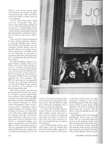 Library, some of the student rebels were sitting on the window sill, alternately grim and gay. The crowd below stared up at them as if they were captive orangutans. Around 1: 00 Commissioner Booth came out of Hamilton. Soon after, about a dozen older blacks climbed out one at a time. Wearing leather jackets, or skull caps, or colorful necklaces, they walked silently, emotionlessly, through the undergraduates and off the campus. No one tried to stop them or talk to them. Later in the day, Booth accompanied by three Harlem politicians, Manhatt,m Borough President Percy Sutton, State Senator Basil Paterson, and Assemblyman Charles Rangel, met with President Kirk to convey their concern about repercussions in Harlem and to ask the University to reconsider its gymnasium plans. Dr. Kirk promised to call a meeting of the Board of Trustees the next day. At 2:00 Psychology Professor Eugene Galanter, Assistant Dean Irwin Glikes, and several others decided to put out a fact sheet to tell the faculty and students what had happened. Rumor and confusion were rife. Spectator had not come out yet. The campus radio station, W'KCR, had not yet started reporting the action promptly. Only SDS was grinding out mimeographed material, of an obviously self-serving sort. But the College Faculty meeting was imminent, so the professors and deans postponed the idea. The communications gap between the administration, faculty and majority of students, and the student rebels was a wide one. With astonishing speed and electronic sophistication, the SDSled whites, much less so the SAS blach, had acquired thousands of dollars worth of loudspeakers, 35mm. cameras, moving picture equipment, mimeograph equipment and supplies, Xerox machines, and dozens of walkie-talkie radios. They had a public relations officer, Jonathan Shils '68, and frequent press conferences. They were in constant touch with the Liberation News Service, a revolutionary-hippy news agency, founded last year by Marshall Bloom, a 23-year old Amherst graduate who was suspended from the London School of Economics for radical activity, and Raymond Mungo, a 22路-year-old 28