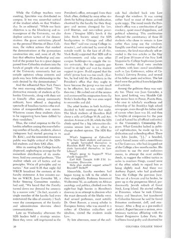 vVhile the College teachers were meeting, Spectator was distributed on campus. It too was somewhat critical of the student rebels on that Wednesday. In an editorial: "While our basic objection is to the blundering and intransigence of the University, we also deplore certain tactics of the demonstrators: the grave restrictions placed on the personal liberties of Dean Coleman; the violent actions that marked the demonstrations at the gymnasium construction site; and, most of all, the fact that effective leadership and control of the protest has to a great degree passed from Columbia students into the hands of people who are not members of the University community but are outside agitators whose interests qnd goals may bear little relationship to the ends desired by the demonstrators." And the inRuential New York Times the next morning editorialized: "The destructive minority of students at Columbia University, along with their not so friendly allies among community militants, have offered a degrading spectacle of hoodlum tactics-the exaltation of irresponsibility over reason. Whatever causes these students claim to be supporting have been defiled by their vandalism." Thus, the initial response to the Columbia rebellion among the overwhelming number of faculty, students, alumni (telegrams had started pouring in to Dr. Kirk), and the interested American public was highly critical of the SDSled students and their SAS allies. After its meeting the College faculty dispersed, neglecting to arrange for the immediate distribution of its resolutions. Said one annoyed professor, "The student rebels are all tactics and no principles. We're all principles and no tactics." Not until 9:35 that night did WKCR broadcast the contents of the faculty statement. A few minutes earlier on ''''KCR, Juan Gonzalez '68, :l Strike Steering Committee member, had said, "We heard that the Faculty turned down our demand for amnesty by a narrow vote." (In fact, scarcely a single member of the faculty had even en~ertained the idea of amnesty.) Such were the consequences of the faculty and administration slowness about communications. Late on Wednesday afternoon the SDS leaders held a strategy session. Here they were: self-imprisoned in the 30