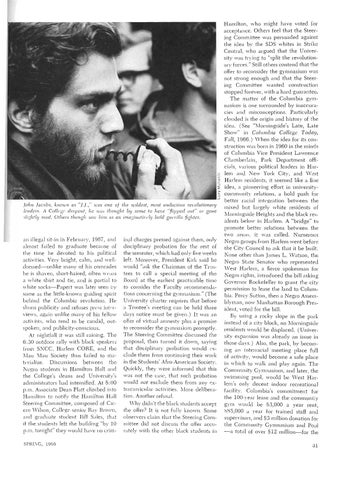 Hamilton, who might have voted for acceptance. Others feel that the Steering Committee was persuaded against the idea by the SDS whites in Strike Central, who argued that the University was trying to "split the revolutionary forces." Still others contend that the offer to reconsider the gymnasium was not strong enough and that the Steering Committee wanted construction stopped forever, with a hard guarantee. The matter of the Columbia gymnasium is one surrounded by inaccuracies and misconceptions. Particularly clouded is the origin and history of the idea. (See "Morningside's Late, Late Show" in Columbia College Today, Fall, 1966.) When the idea for its construction was born in 1960 in the minds of Columbia Vice President Lawrence Chamberlain, Park Department officials, various political leaders in Harlem and ew York City, and West Harlem residents, it seemed like a fine idea, a pioneering effort in universitycommunity relations, a bold push for better racial integration between the mixed but largely white residents of ~Iorningside Heights and the black residents below in Harlem. A "bridge" to promote better relations between the two areas, it was called. umerous Negro groups from Harlem went before the City Council to ask that it be built. None other than James L. 'Watson, the Negro State Senator who represented \Vest Harlem, a fierce spokesman for Negro rights, introduced the bill asking Governor Rockefeller to grant the city permission to lease the land to Columbia. Percy Sutton, then a Negro Assemblyman, now Manhattan Borough President, voted for the bill. By using a rocky slope in the park instead of a city block, no Morningside residents would be displaced. (University expansion was already an issue in those days.) Also, the park, by becoming an interracial meeting place full of activity, would become a safe place in which to walk and play again. The Community Gymnasium, and later, the swimming pool, would be West Harlem's only decent indoor recreational facility. Columbia's commihnent for the 100-year lease and the community gym would be $3,000 a year rent, $85,000 a year for trained staff and supervisors, and $3 million donation for the Community Gymnasium and Pool -a total of over $12 million-for the