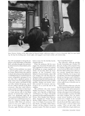 "The United Black Front." That afternoon, while the Ad Hoc Faculty Committee met, Charles 37X Kenyatta, leader of the extremist Mau Mau Society in Harlem, had harangued a crowd of over 500 students in front of Hamilton Hall, making some inflammatory remarks. Among other things he said that Columbia was trying to take over Harlem, that Morningside Heights should now become a part of Harlem, that the gym ought to be re-negotiated with "the people" of Harlem, and that whites ought to turn Columbia over to black people. These remarks by Kenyatta, plus the fact that several dozen faculty members of more liberal and radical persuasion had put on white armbands and were sitting on the steps in front of Hamilton and Fayerweather to protect the SDS and black students from the police, caused several hundred of the more conservative students to be screwed up to a new fury. "Kenyatta is as bad ;IS Lincoln Rockwell. They ought to throw him off campus," said one student. Said another, "Fil"st we get called white racists by SDS, then we get called scum COLUMBIA COLLEGE TODAY