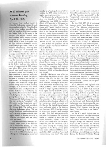 months of a "spring offensive" at Columbia, the fifth oldest institution 0f higher learning in America. The Students for a Democratic Society was founded at Port Huron, Michigan in June 1962, the product chiefly of University of 'lichigan undergraduates like Albert Haber, Paul Potter, and Thomas Hayden, who was elected its first president. It was an offshoot of the League for Industrial Democracy, a tiny organization of socialists and quasi-socialists who were also passionate democrats-men like orman Thomas, Michael Harrington, Harold Taylor, and Bayard Rustin. (Albert Haber was president of the Student League for Industrial Democracy in 1961-62.) Like Columbia philosopher John Dewey, the SDS wanted to democratize American society more fully; that is, make every institution in the United States a participatory democratic cell in an almost Athenian way. 'iV'orkers should have a voice in running their factories, Negroes their ghetto schools and welfare programs, and students their universities, SDS contended. In September 1963 a Columbia chapter was formed. Initially, SDS spent most of its energy aiding the Negroes in civil rights actions. The SDS at first saw itself largely as a campus-based, middle class, northern counterpart to the Student Nonviolent Coordinating Committee, or SNCC, which was active on behalf of Jegro equality in the South. Civil rights activity led SDS quickly into community organization, or the stirring up of various underprivileged groups into collective action against the authorities in their area in order to gain better jobs, housing, schools, welfare programs, equal treatment, and the like. As the United States became more and more mired in the Vietnam war, however, SDS shifted its emphasis to anti-war publicity and activities in 1964. This shift was prompted by two other developments: the increasing desire of Negroes to have the civil rights movement largely a black-directed affair rather than a white-dominated one, and the failure of SDS to find allies among the working class, especially in the trade unions. (One labor leader told us in 1965 that he regarded the SDS radicals as "screwball, un-American, rich kids." The same