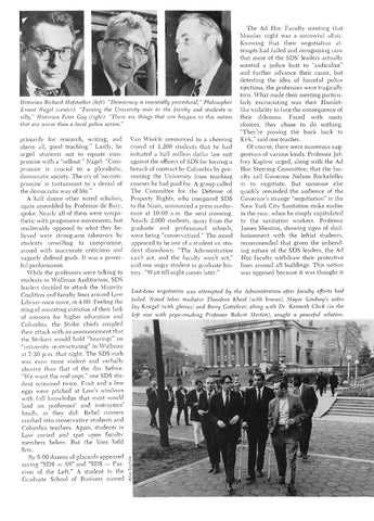 The Ad Hoc Faculty meeting that Monday night was a sorrowful aftair. Knowing that their negotiation attempts had failed and recognizing now that some of the SDS' leaders actually wanted a police bust to "radicalize" and further advance their cause, but detesting the idea of forceful police ejections, the professors were tragically torn. \IVhat made their meeting particularly excruciating was their Hamletlike inability to face the consequence of their dilemma. Faced with nasty choices, they chose to do nothing. "They're passing the buck back to Kirk," said one teacher. Of course, there were numerous suggestions of various kinds. Professor Jeffrey Kaplow urged, along with the Ad Hoc Steering Committee, that the faculty call Governor Nelson Rockefeller in to negotiate. But someone else quickly reminded the audience of the Governor's strange "negotiation" in the New York City Sanitation strike earlier in the year, when he simply capitulated to the sanitation workers. Professor James Shenton, showing signs of disillusionment with the leftist students, recommended that given the unbending nature of the SDS leaders, the Ad Hoc faculty withdraw their protective lines around all buildings. This notion was opposed because it was thought it