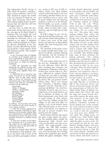 The Independent Faculty Group) at 3:00. About 90 teachers, including a dozen tenure professors, showed up. They decided to support the student strike and continue to battle for amnesty. Said astronomer Lloyd Motz: "The striking students deserve amnesty because they did what they did from the highest motives." An hour later, at 4:00, the combined senior faculty that met on Sunday, met again in St. Paul's Chapel. A resolution that was largely the work of Professor Richal"d Hofstadter was submitted for discussion, but it was regarded as too vague. A substitute motion, drafted principally by Professor Maurice Rosenberg of the Law School, was then offered to the faculty and passed by a large majority of the 550 professors present. The complete resolution read: In Oill niversity's hour of anguish, wc members of its faculties must assume responsibility to help return this University to a community of reason. In this spirit we adopt the following resolutions: 1. That the University set aside Wednesday for reflection so that without classes, students and faculty may meet and reason together about their niversity. 2. That there be an executive committee with power to caJl the faculty together and to take other needed steps to return the University to its educational task at the earliest possible moment and that the committee be composed of the foJlowing: Daniel Bell vValter P. Metzger William Leuchtenberg Alexander DaJlin Eli Ginzberg Polykarp Kusch Ernest agel Michael Sovern Lionel Trilling Alan Westin In addition, the Committee will co-opt two members of the junior faculty to sit as voting members. 3. That the recently appointed tripartite committee consisting of representatives of the faculty, student body and administration immediately begin functioning to assure due process and equitable treahnent to students facing charges. 4. That each member of the Columbia community act in a mannlir showing respect for his coJleagues and assuring the return to life and health of this great University. Outside the Chapel about 200 leftist demonstl"ators had gathered. The~' sat on the brick walk in front of the doors and held a participatory democ-