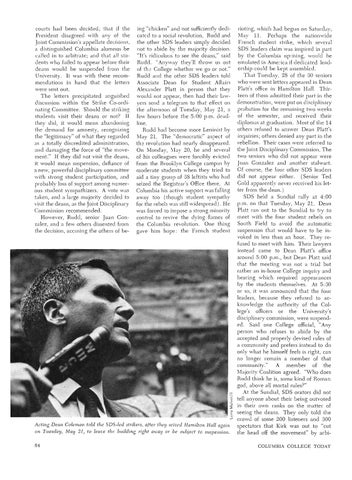 rioting, which had begun on Saturday, May 11. Perhaps the nationwide French student strike, which several SDS leaders claim was inspired in part by the Columbia up:-ising, would be emulated in America if dedicated leadership could be kept assembled. That Tuesday, 28 of the 30 seniors who were sent letters appeared in Dean Platt's office in Hamilton Hall. Thirteen of them admitted their part in the demonstration, were put on disciplinary probation for the remaining two weeks of the semester, and received their diplomas at graduation. Most of the 14 others refused to answer Dean Platt's inquiries; others denied any part in the rebellion. Their cases were referred to the Joint DiSCiplinary Commission. The two seniors who did not appear were Juan Gonzalez and another stalwart. Of course, the four other SDS leaders did not appear either. (Senior Ted Gold apparently never received his letter from the dean.) SDS held a Sundial rally at 4:00 p.m. on that Tuesday, May 21. Dean Platt ran out to the Sundial to try to meet with the four student rebels on South Field to avoid the automatic suspension that would have to be invoked in less than an hour. They refused to meet with him. Their lawyers instead came to Dean Platt's office around 5:00 p.m., but Dean Platt said that the meeting was not a trial but rather an in-house College inquiry and hearing which required appearances by the students themselves. At 5:30 or so, it was announced that the four leaders, because they refused to acknowledge the authority of the College's officers or the University's disciplinary commission, were suspended. Said one College official, "Any person who refuses to abide by the accepted and properly devised rules of a community and prefers instead to do only what he himself feels is right, can no longer remain a member of that community." A member of the Majority Coalition agreed. "Who does Rudd think he is, some kind of Roman god, above all mortal rules?" At the Sundial, SDS orators did not ] tell anyone about their being outvoted ~ in their own ranks on the matter of >- seeing the deans. They only told the .3 crowd of some 200 listeners and 300 Acting Dean Coleman told the SDS-led strikers, after they seized Hamilton Hall again spectators that Kirk was out to "cut on Tuesday, May 21, to leave the bUilding right away 01' be subject to suspension. the head off the movement" by arbi-