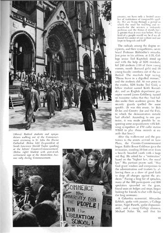 The radicals among the degree recipients, and their svmpathizers, never heard Professor Hofstadter's remarks. Just prior to his address, at 3:35, College senior Ted Kaptchuk stood up and with the help of SDS marshals, led 240 students (110 of them \loung women, mostl\' Barnard girls) and 18 young faculty members out of the cathedral. The marshals kept saying, "Please leave in a dignified manner," and the students did. At one point in the exodus, SDS leader Ted Gold, a fellow student named Keith Kornofsk~r, and an English department preceptor named James Goldberg, turned on transistor radios that thev had hid路 den under their academic gowns. But security guards quelled the noise quickly. (It was this music, b~' Bob Dylan and Countrv Joe and the Fish, to which the demonstrators outside had alluded. According to one protestor, it was made possible b~' requesting some acquaintances with leftwing svmpathies at FM radio station WBAI to play those records at exactly that houL) After the walkers-out and the protestors in the streets arrived on Low Plaza, the Counter-Commencement began. Rabbi Bruce Goldman gave the invocation, standing 10 feet awav from a heavilv bearded \louth with a huge red Rag. He asked for a "restoration" based on the "highest law, the moral law." His partisan prayer said, ":\lay God grant wisdom and compassion to the administration and trustees b\路 allowing them as a show of good faith to drop all charges against the students." Facing a long list of speeches, many of the 300 participants and 600 spectators sprawled on the grass, found seats on ledges and steps, began looking for friends to chat with during the long ceremonv. A Columbia economist, Alexander Erhlich, spoke with passion; a College senior, Nigel Paneth, spoke dispassionatelv; and a young College alumnus, Michael Nolan '64, said that his 95