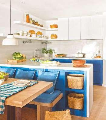 LA PENÍNSULA separa la cocina del office. Lleva armarios abiertos para colocar cestas con el mantel, las servilletas...