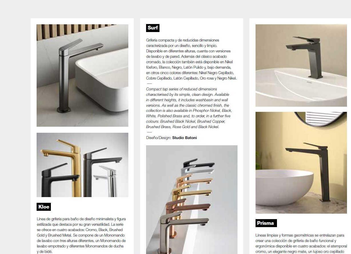 Una silueta limpia y formas geométricas se entrelazan para crear piezas visualmente impresionantes a la vez que funcionales y ergonómicas. Cuatro acabados (abajo, oro cepillado), variedad de tamaños y modelos y sistema integrado de ahorro de agua.