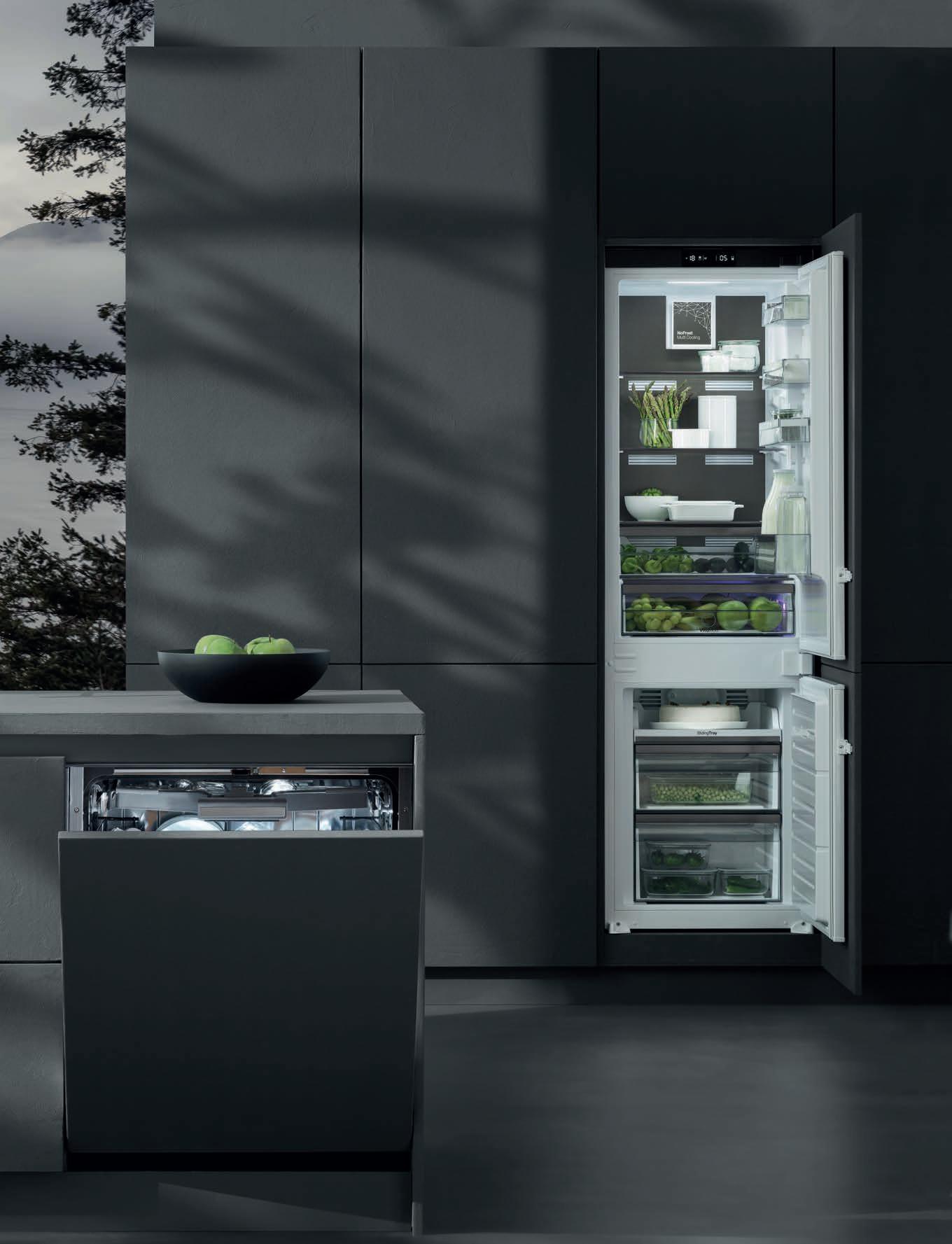 Aura is the pure cold of built-in combi-refrigerators available in Advance and One versions. High technological performance for the two completely independent cooling and freezing systems, the ZeroDegree zone, and the VitaMod drawer whose lighting mimics the spectrum of sunlight, friendly to vitamin C, found in fruits and vegetables. High aesthetic content thanks to the internal finishes that choose metal and light to preserve, conserve, and celebrate food.