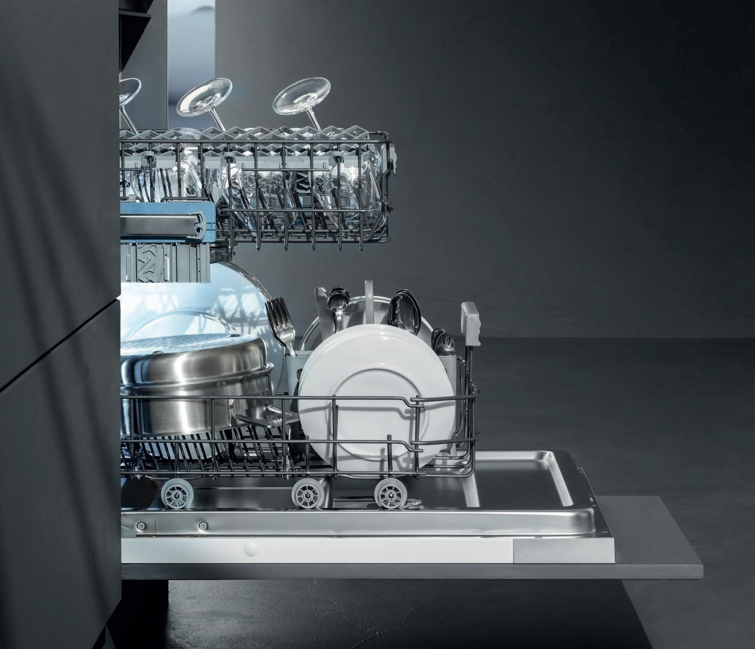 • 3 cestelli dark grey (cesto inferiore fisso con 4 rastrelliere ripiegabili, cestello superiore con 2 rastrelliere ripiegabili, 4 alette e 2 altezze regolabili, terzo cestello posate fisso)