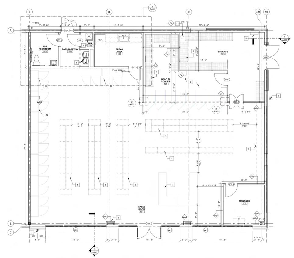 Completed as-built and lease outline drawings for commercial projects including retail spaces, offices, restaurants, schools, and industrial projects.