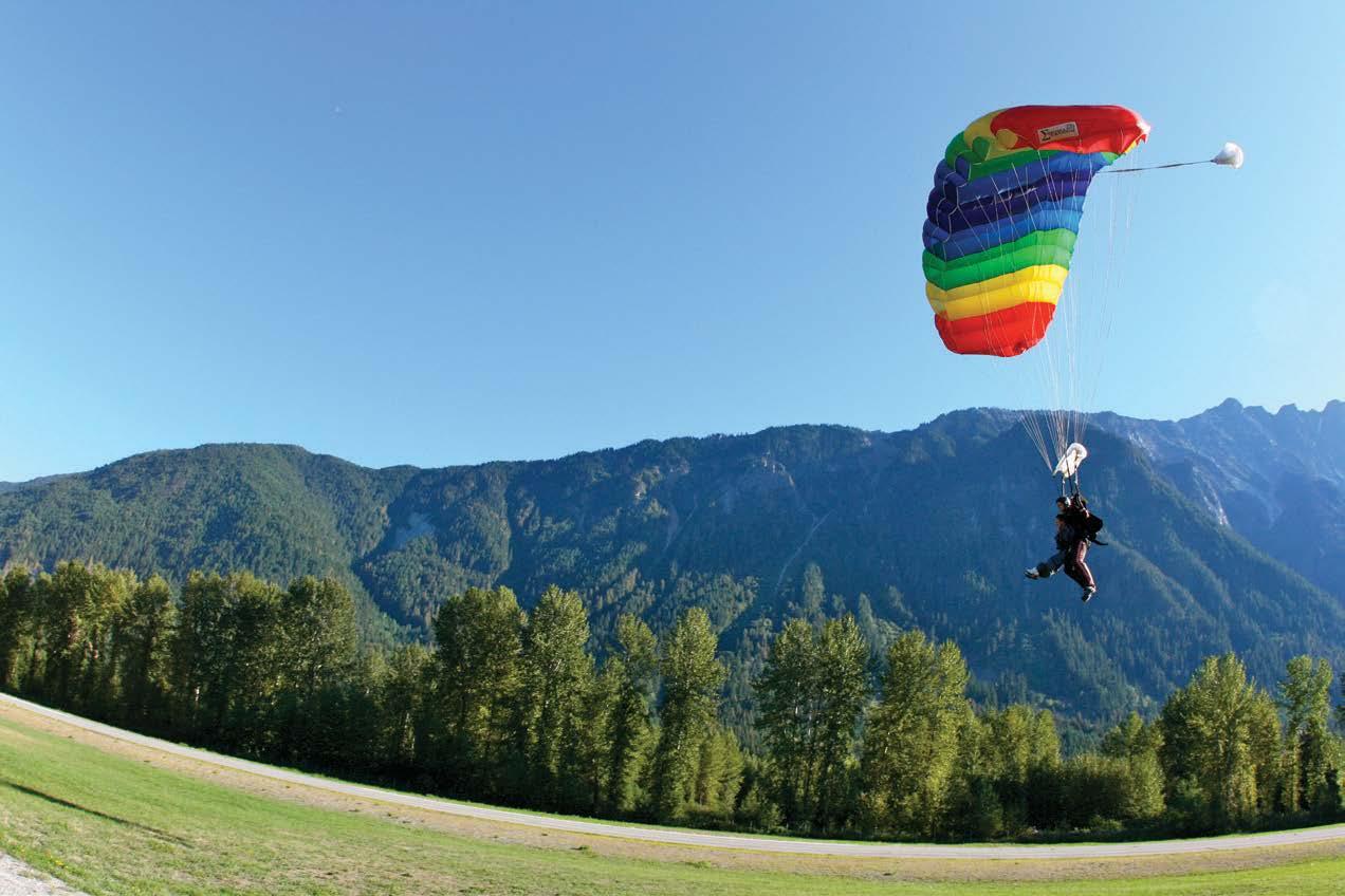 This incredible experience includes a scenic ight around Mt. Currie, Whistler, and Blackcomb before you take the jump of a lifetime! While harnessed to your experienced Instructor you will have an exhilarating freefall followed by a thrilling canopy ight, ending with a safe landing and a huge smile!