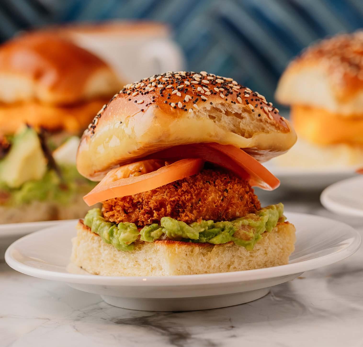 Crispy Cajun Chicken ~ Spicy breaded chicken breast with guacamole, chipotle mayo, pepper jack cheese, lettuce, tomato, pickles, and onion