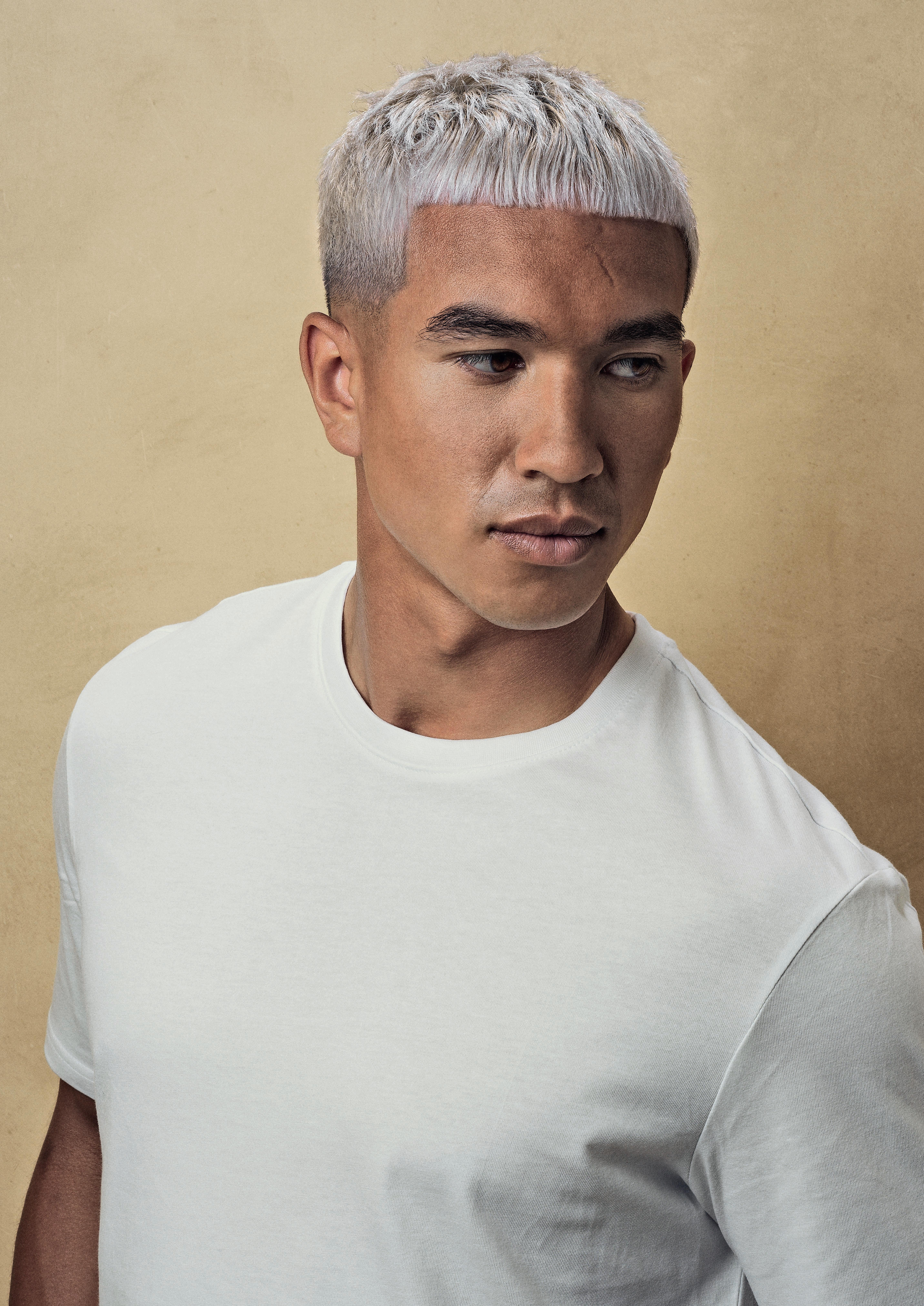 Take your roughest matte products and work them into the hair in back-andforth motions allowing the hair to overlap and bring out the extreme texture that’s been cut in. I used STMNT Dry Clay with a little Spray Powder to refine.