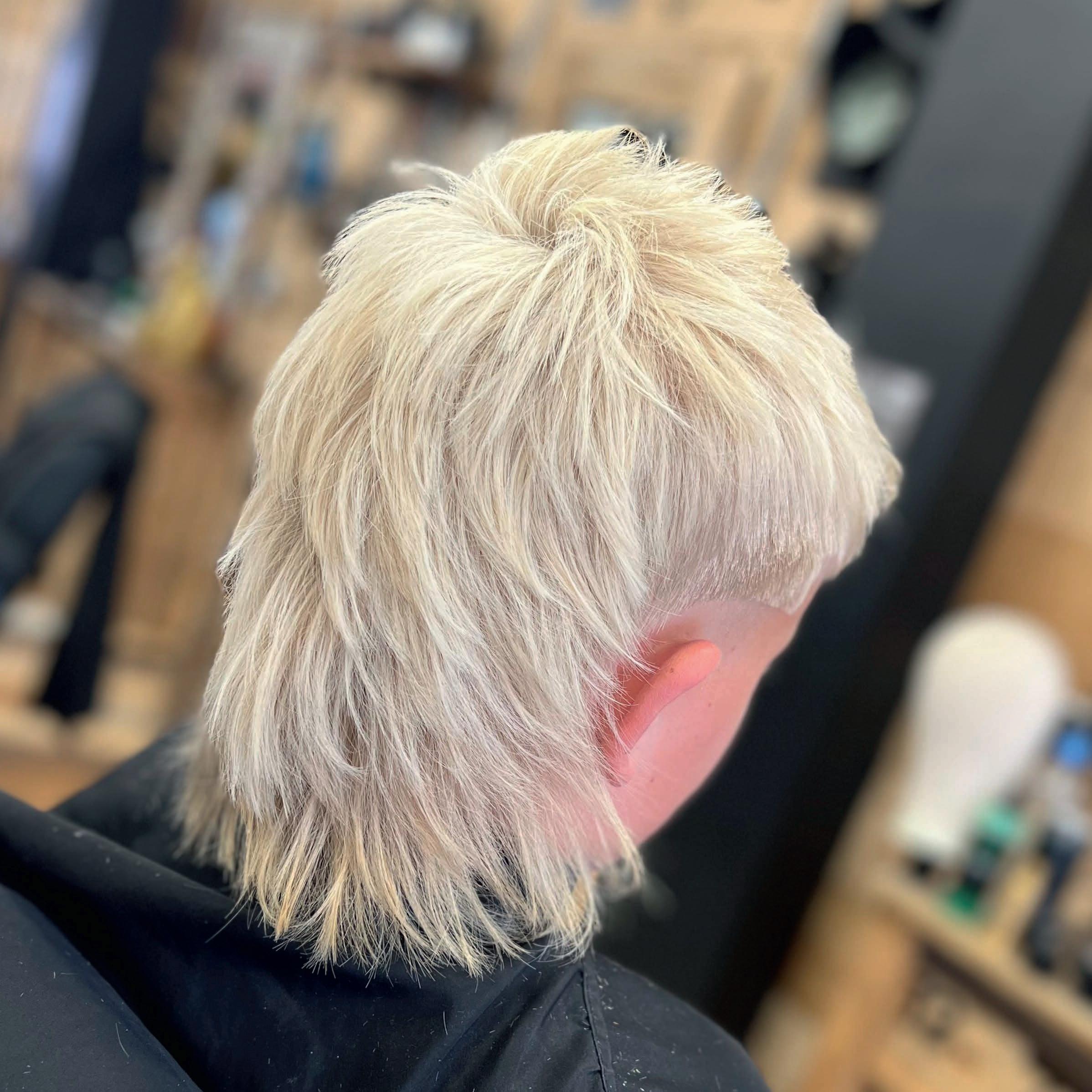 Taking horizontal sections from the crown down, use a deep point cutting technique to break up the edges and create more movement throughout the back of the mullet.