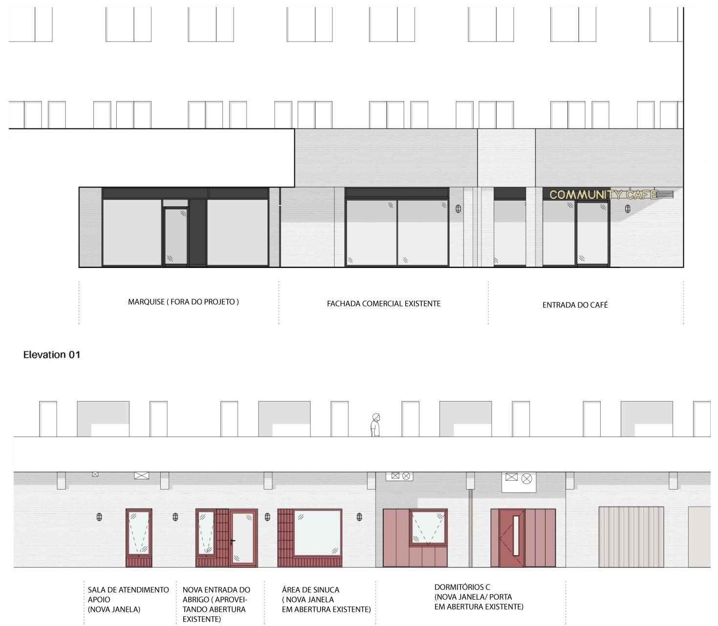 Devido a restrição de prazo e de recursos financeiros disponíveis para o projeto, a fachada original foi alterada minimanete, trocando-se os materiais e aproveitando aberturas já existentes para os acessos e janelas ( Figura 52