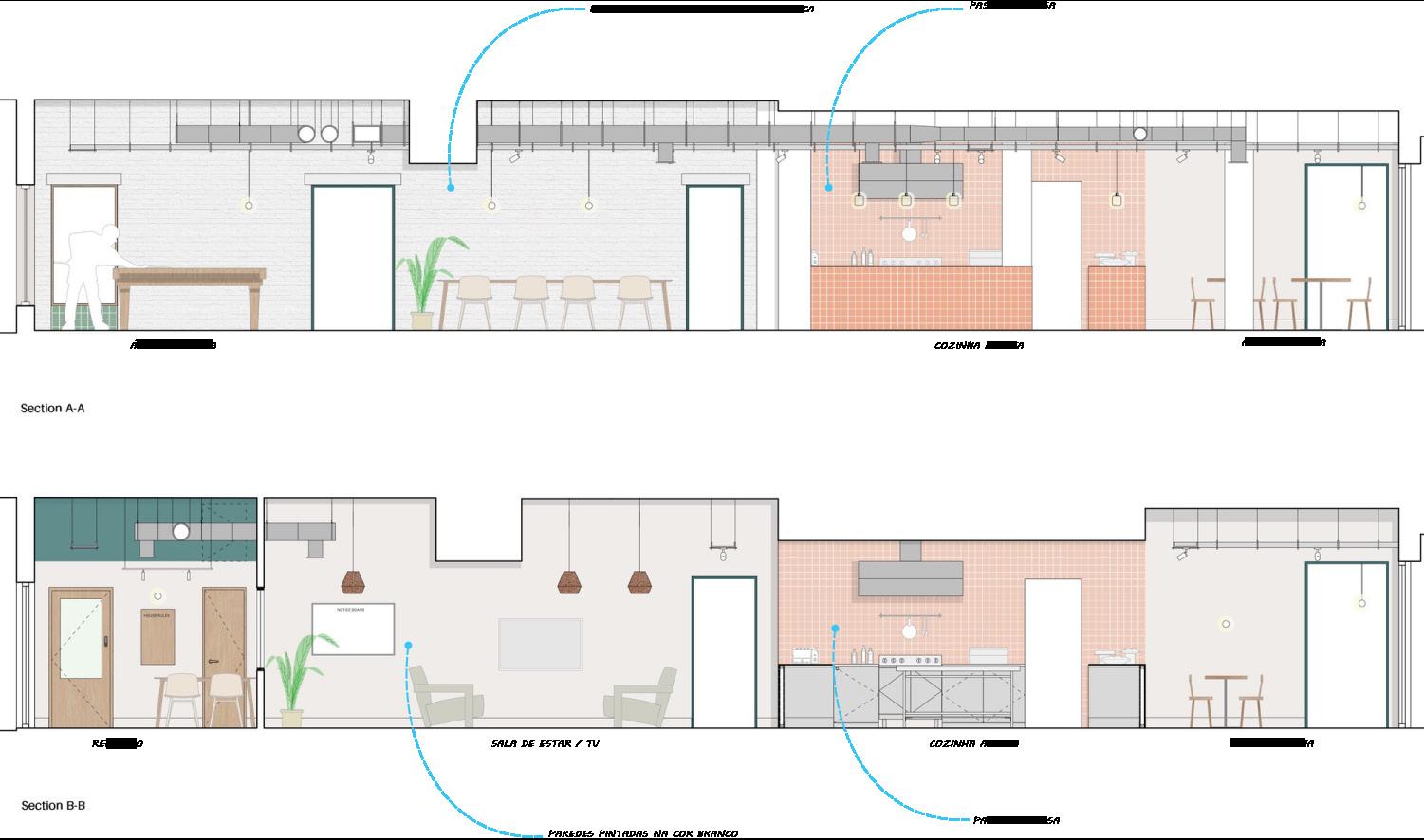 Pela análise dos cortes humanizados não nota-se a presença de desnível entre os ambientes sociais, talvez herança do uso prévio do edifício. Nos desenhos também é possível ver a quantidade e variação nos tipos de luminárias, o que resulta nas qualidades mencionadas anteriormente.