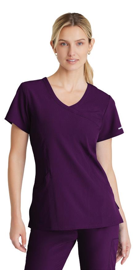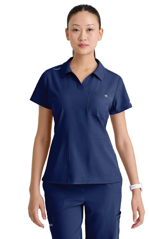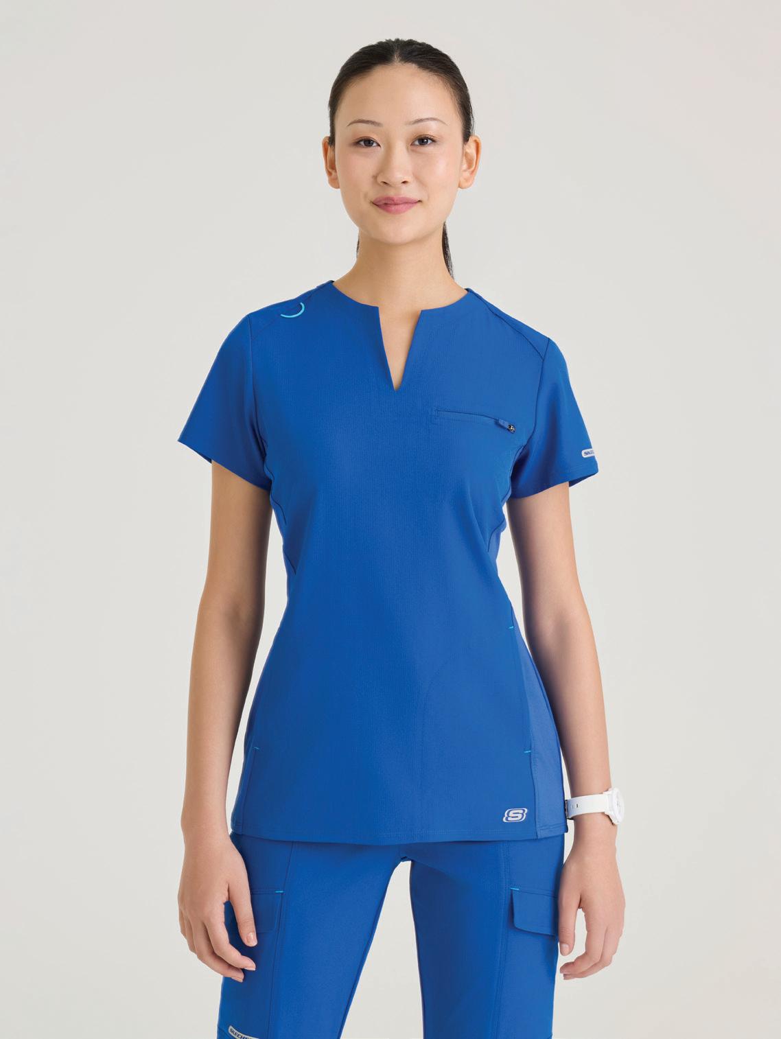 1-pocket banded curved V-neck, chest patch pocket, front and back princess seams, shoulder Steel badge loop, tulip hem top