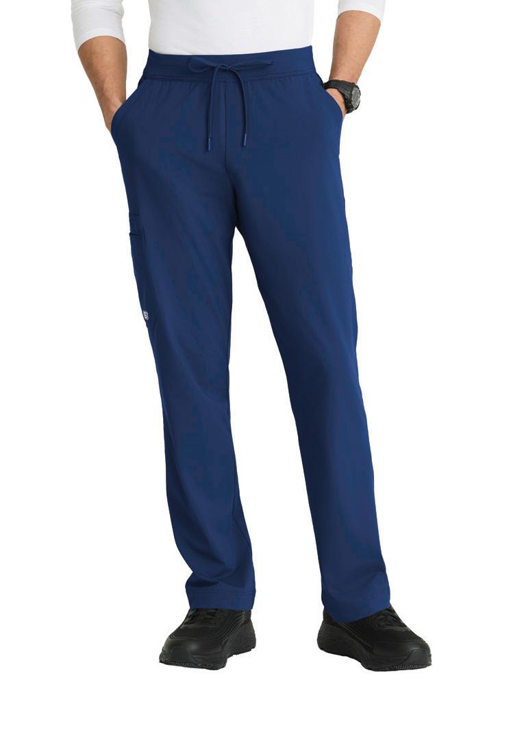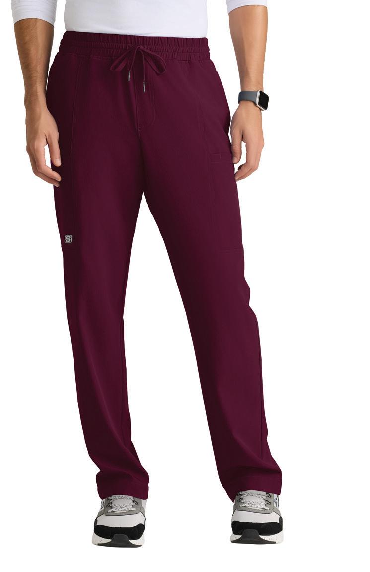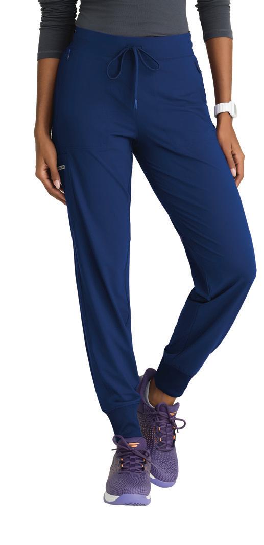 5-pocket encased elastic waistband with drawcord, on-seam zipper front pockets with shadow top stitching, patch cargo pocket with pen slot, ribbed cuff jogger