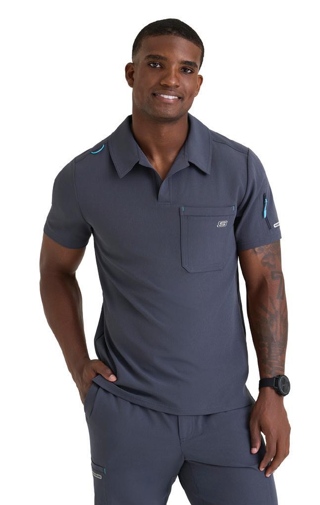 3-pocket V-neck with shirt collar, right shoulder badge loop, on-seam chest pocket, waist patch pockets, cuffed dolman sleeves, adjustable hem relaxed-fit top