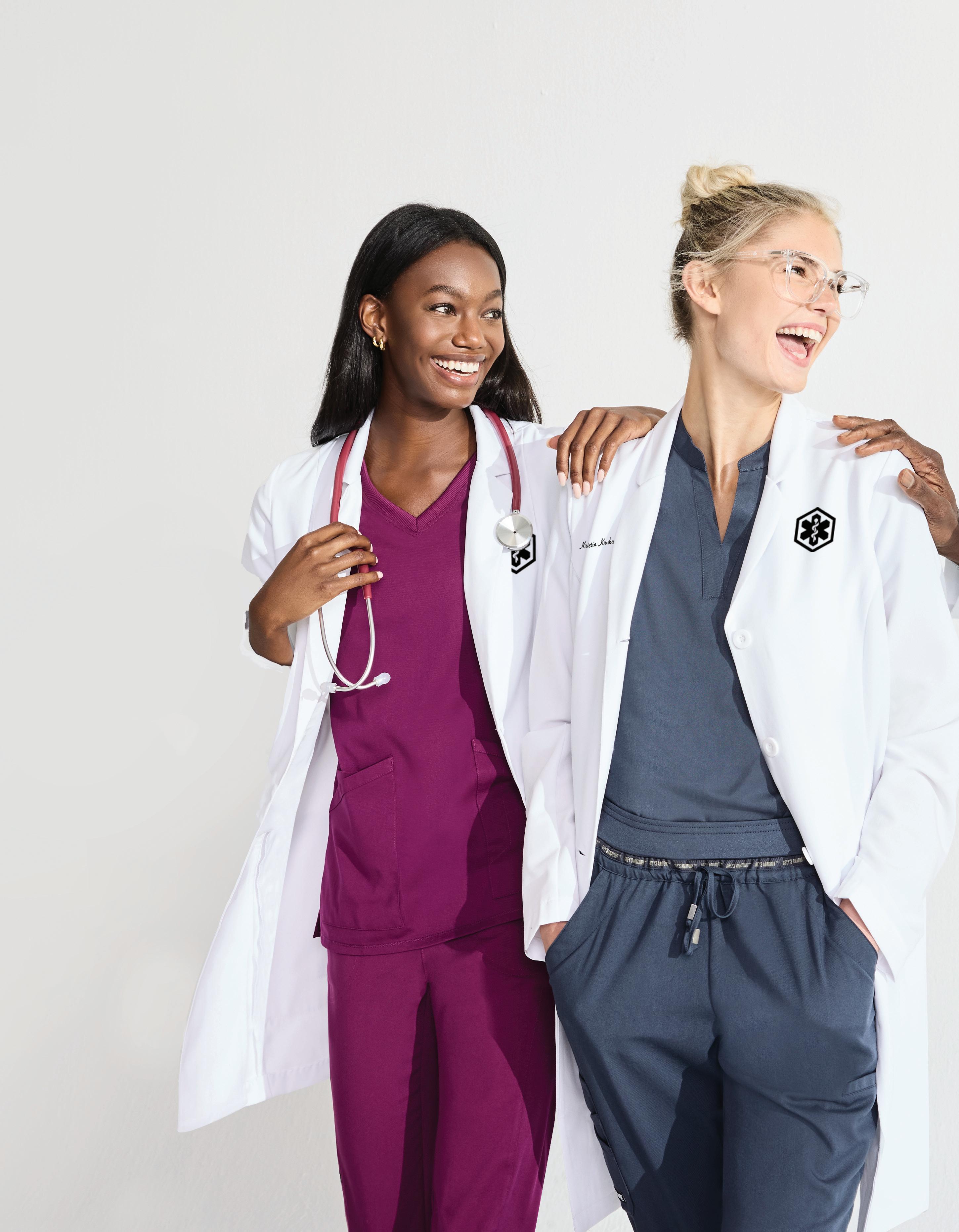Women's 3-pocket 3-button, notch lapel, front princess seams, tablet waist pockets, back belt with center back vent, long sleeve lab coat