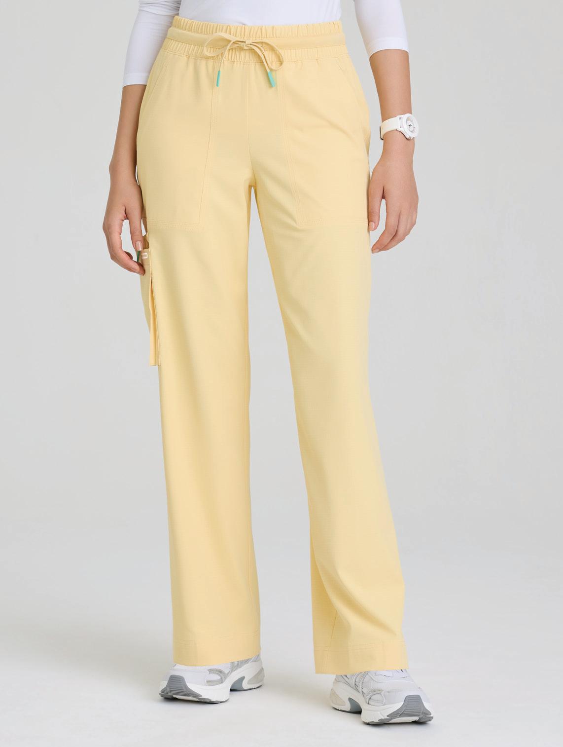 4-pocket flat waistband with drawcord and inside logo elastic, angled zipper front pockets, patch cargo pocket with pen slot, back patch pocket, fit & flare pant