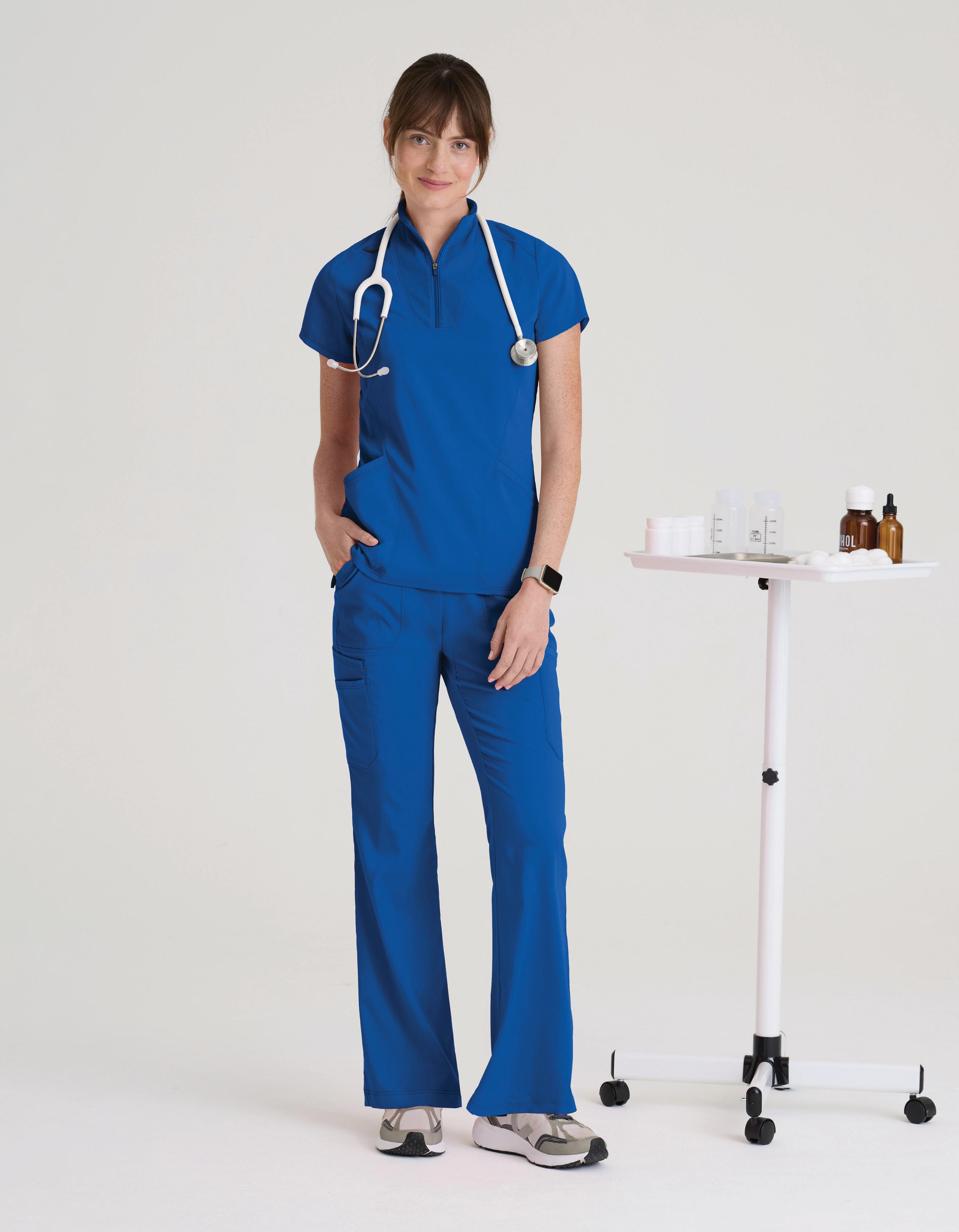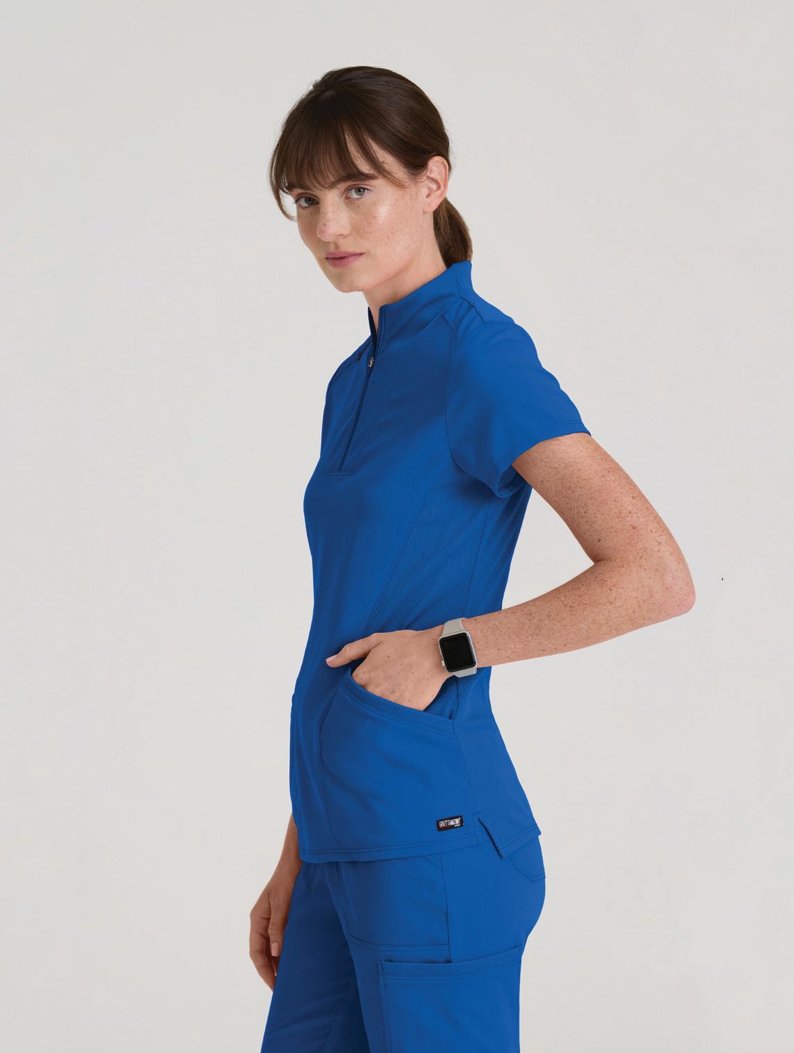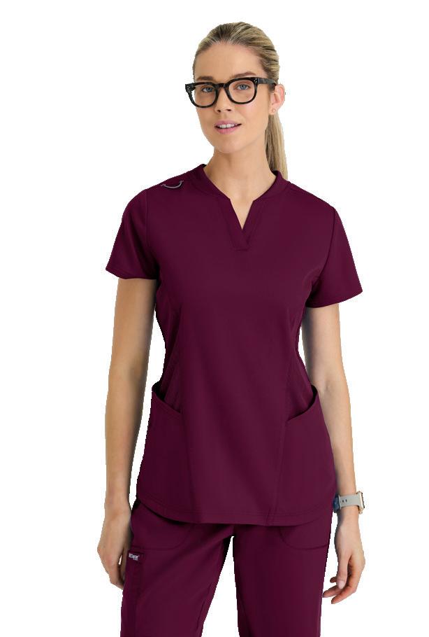 GRST045 Serena Top 3-pocket, ribbed V-neck, PDA pocket, logo tape side slit detail, rib knit back insets with princess seam, straight hem