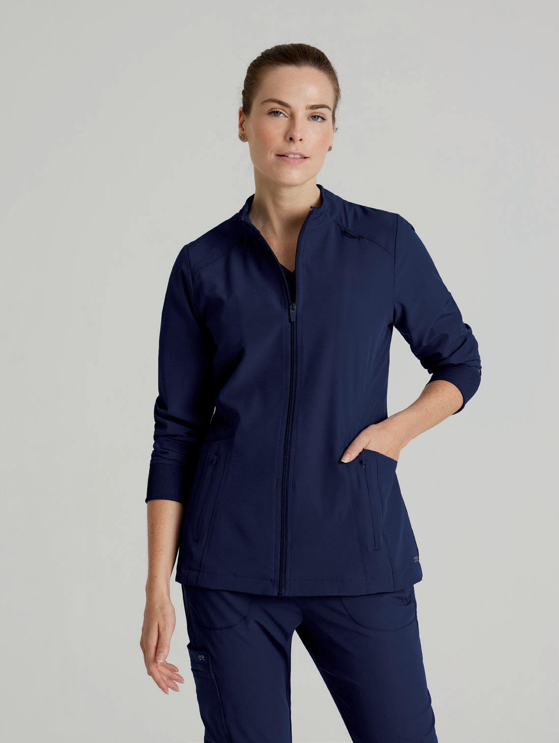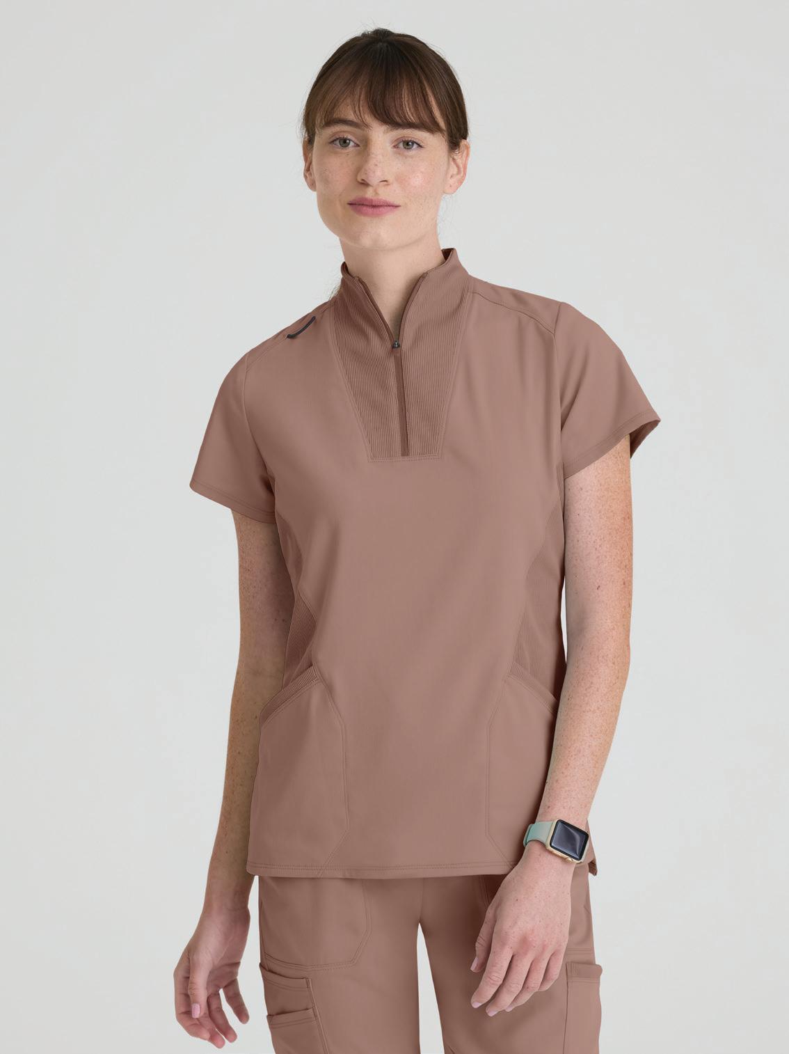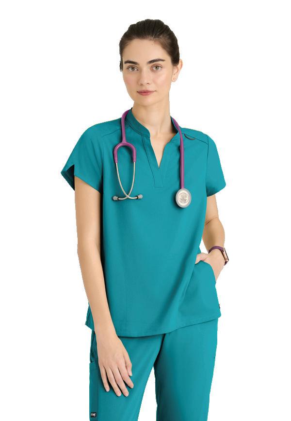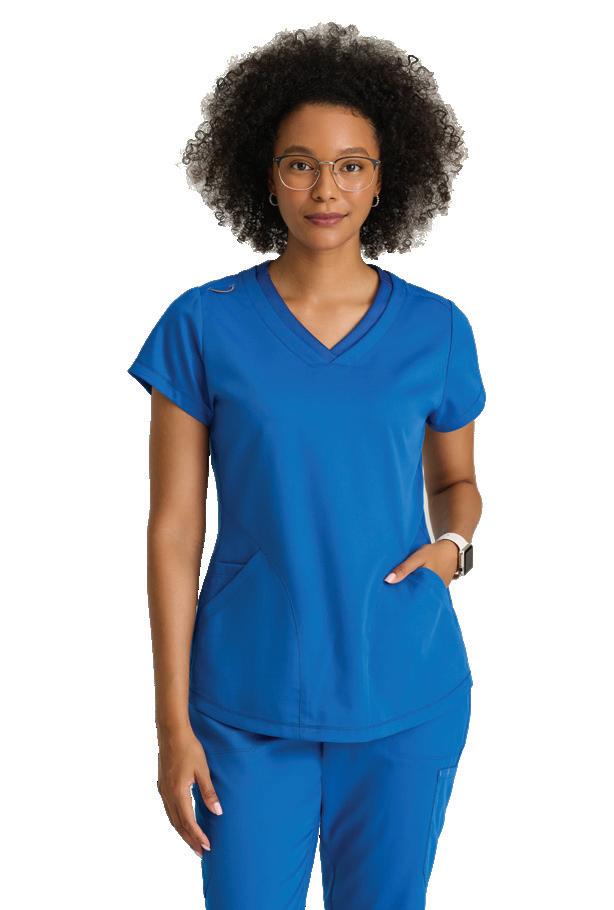 GRST045 Serena Top 3-pocket, ribbed V-neck, PDA pocket, logo tape side slit detail, rib knit back insets with princess seam, straight hem