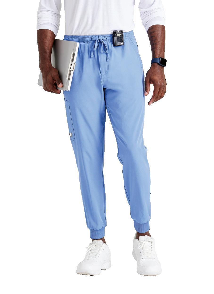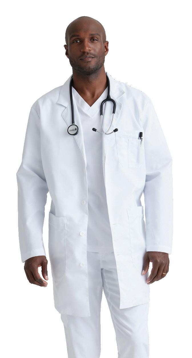 Men’s 6-pocket long sleeve notch lapel lab coat, welt chest pocket, tablet pocket, angled front body seams with top-entry waist pockets, 2 waist welt pockets, tablet pockets, angled back yoke seam, extended vent opening at the side seams, and vented sleeve opening with 2-button closure. RELAXED FIT