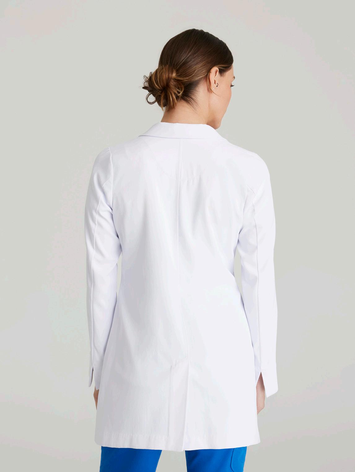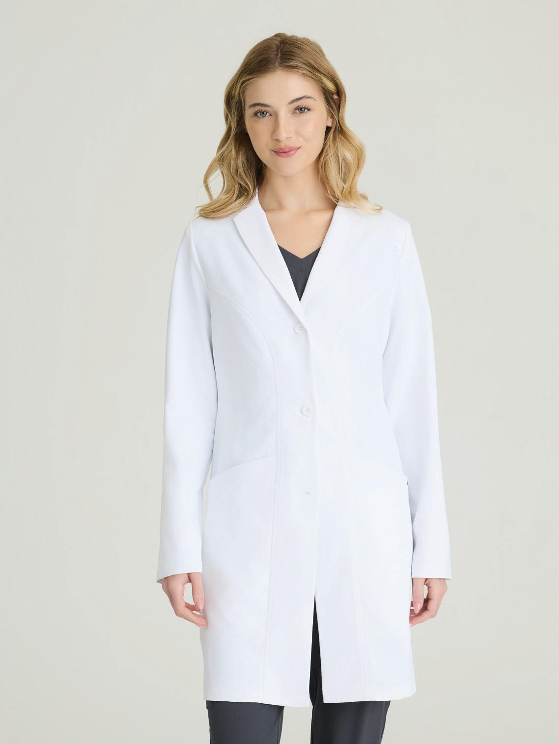 Women’s 4-pocket long sleeve lab coat, notch lapel, angled front yoke with on-seam pocket and pen slots, half-circle front princess seams with curved on-seam tablet friendly pockets, and back princess seams with vents. SEMI-FITTED