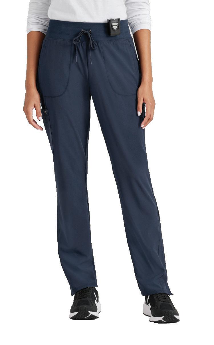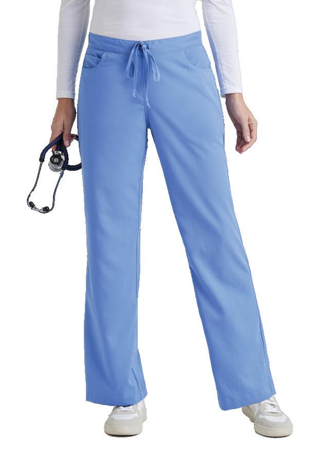 6-pocket high-rise, flat front waistband with inner self drawcord, back tabs, back patch pockets, straight leg pant