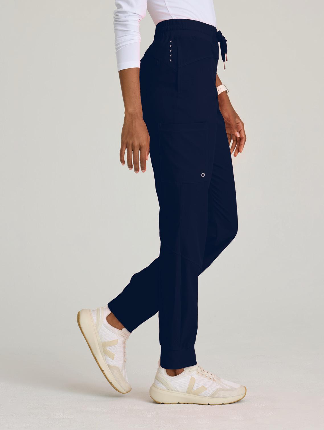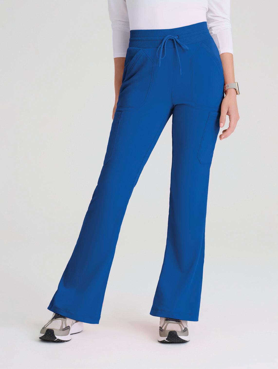 7-pocket, duchess knit waistband with drawcord, mid-rise, patch pockets, double cargo, slit hem, logo tape detail tapered leg