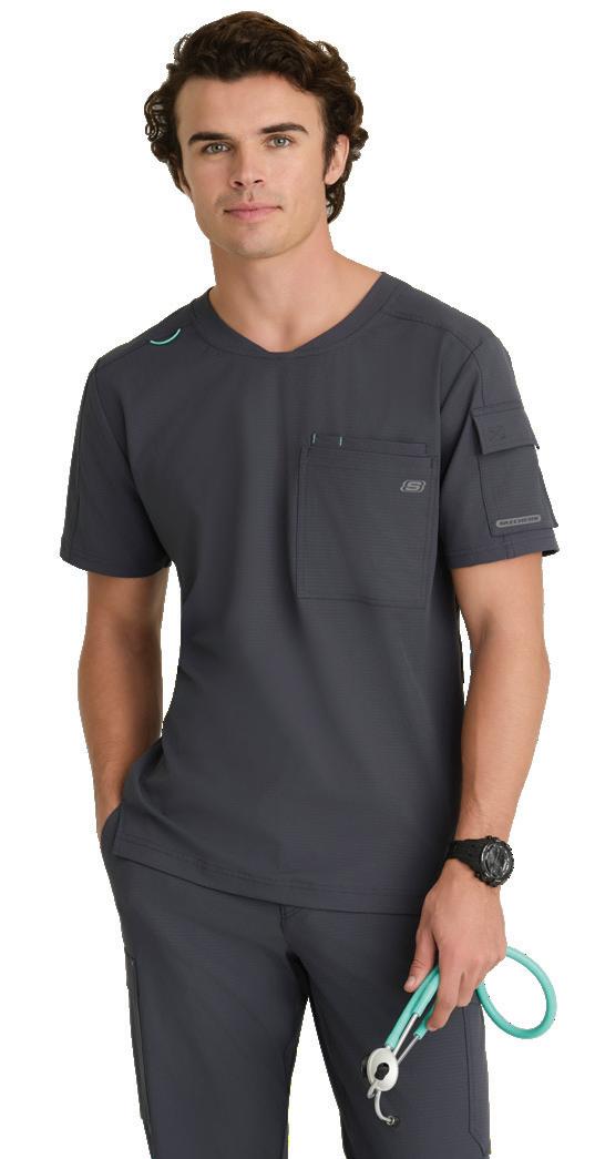 Men’s 2-pocket banded V-neck, right shoulder badge loop, framed zipper chest pocket, left sleeve patch pocket, notched high-low hem top