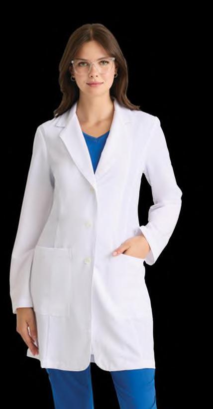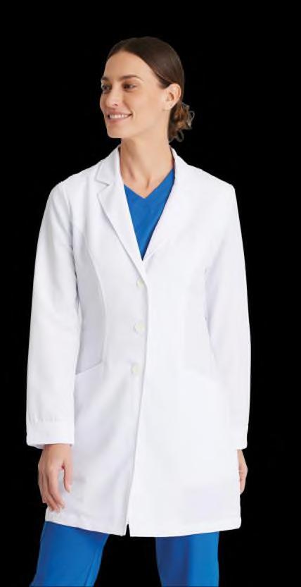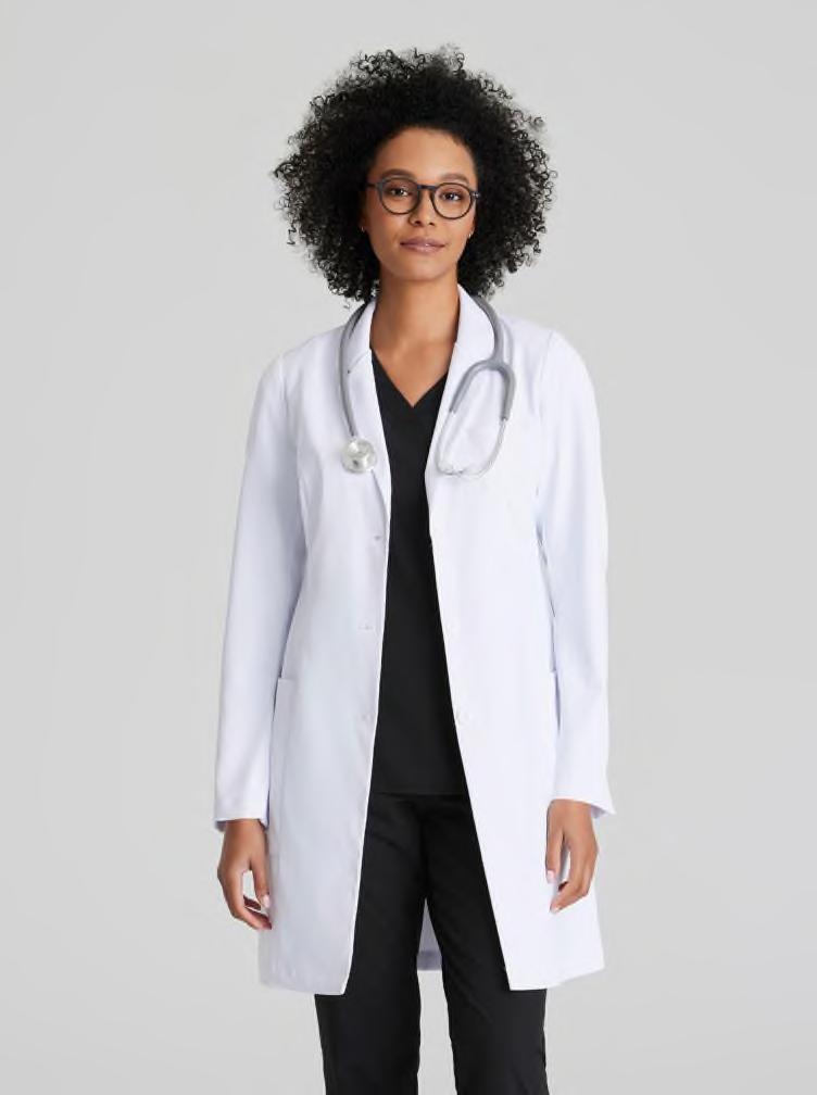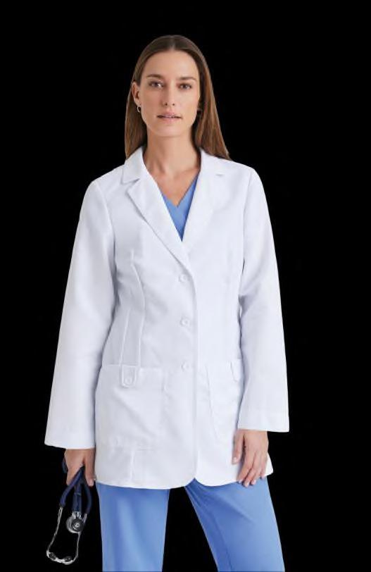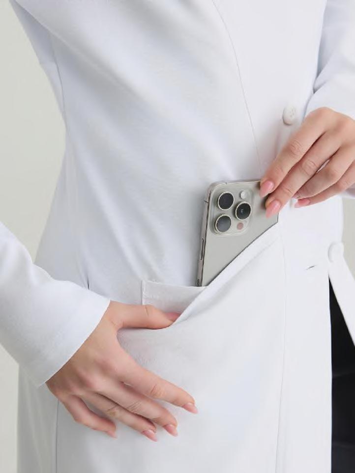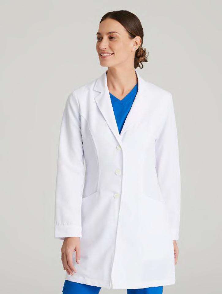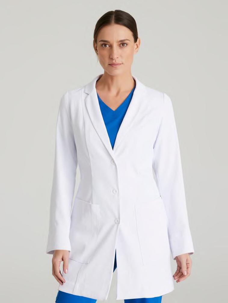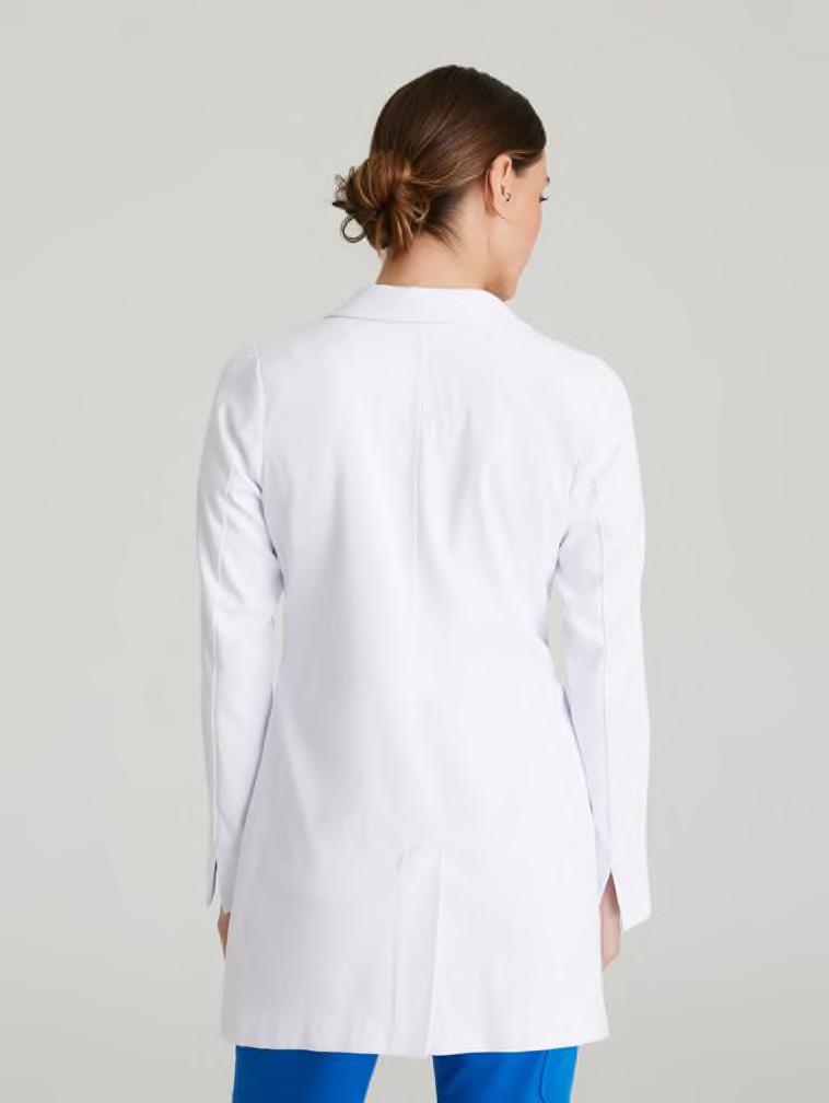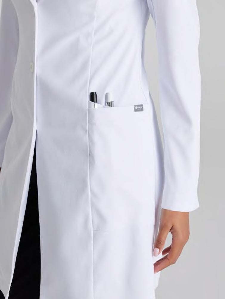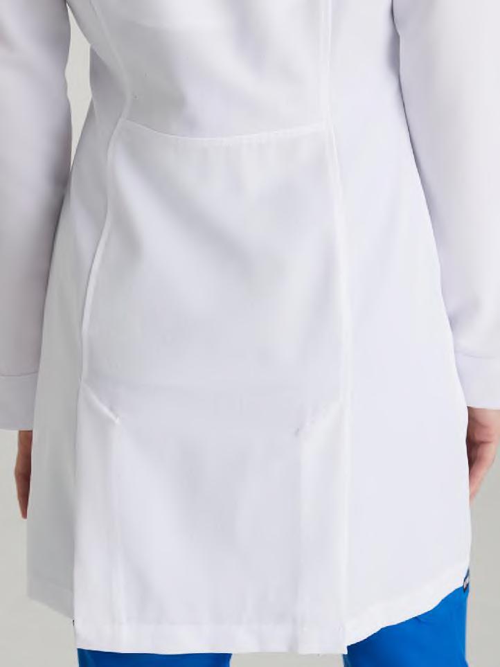 Bata de laboratorio moderna de manga larga con tres bolsillos para mujer, solapa con abertura, costuras princesa en la parte delantera, bolsillos en la cintura con acceso superior aptos para tabletas y ranuras interiores para bolígrafos, abertura central en la espalda, puños con aberturas, lazo para colgar y etiqueta en el bolsillo