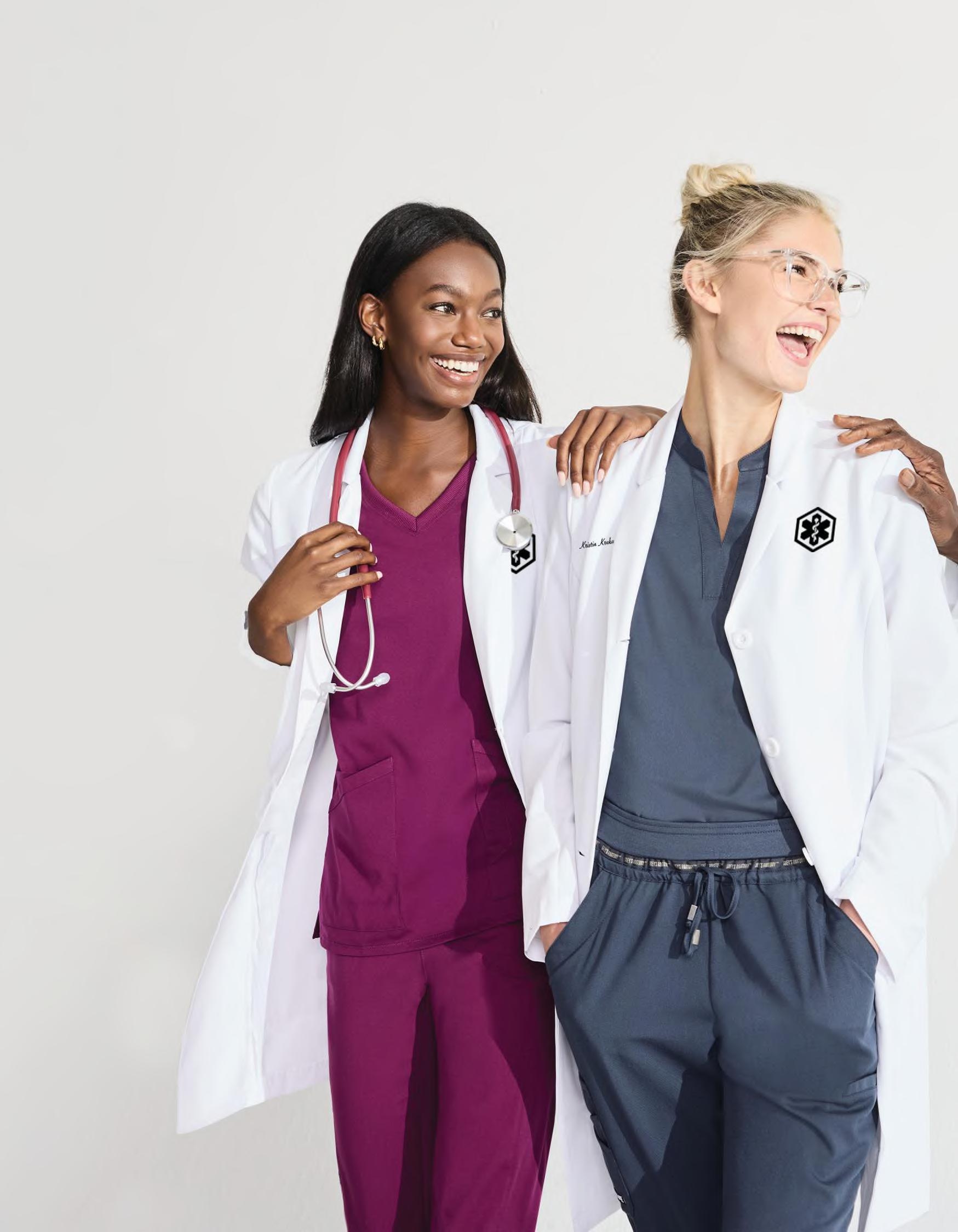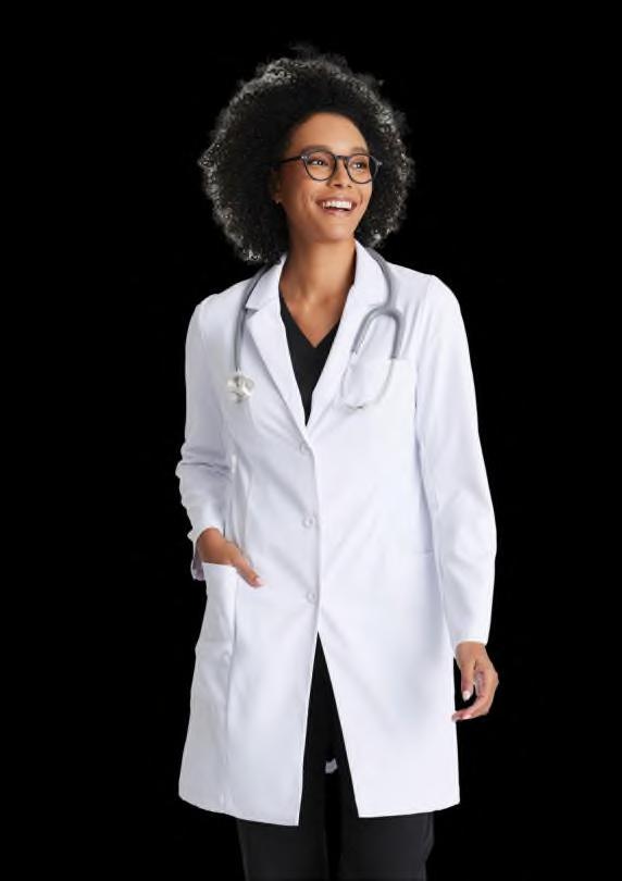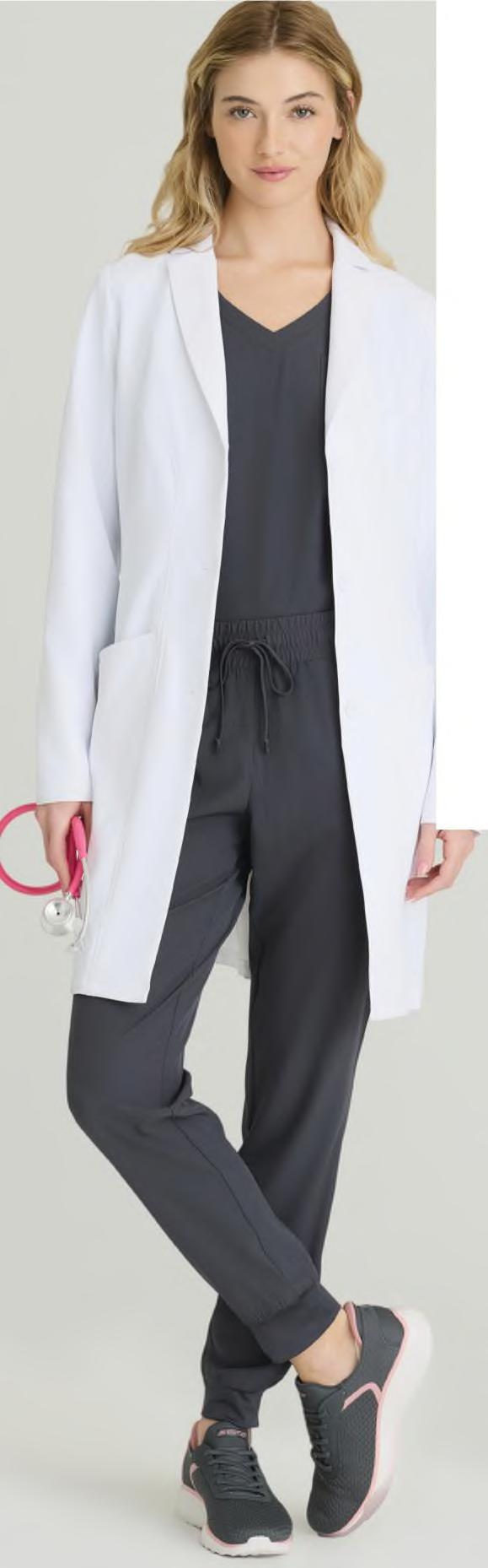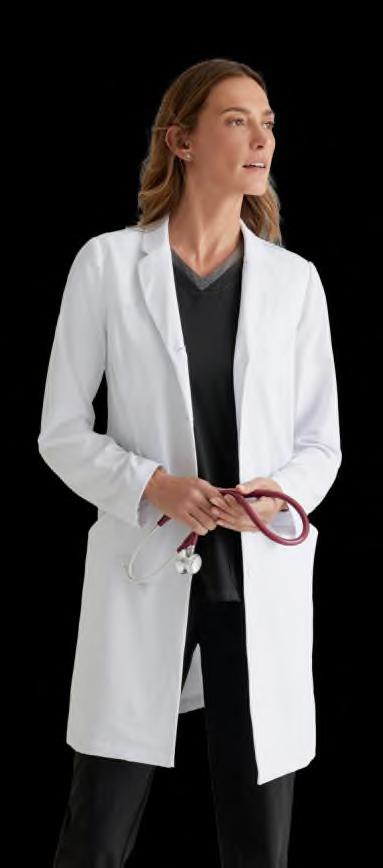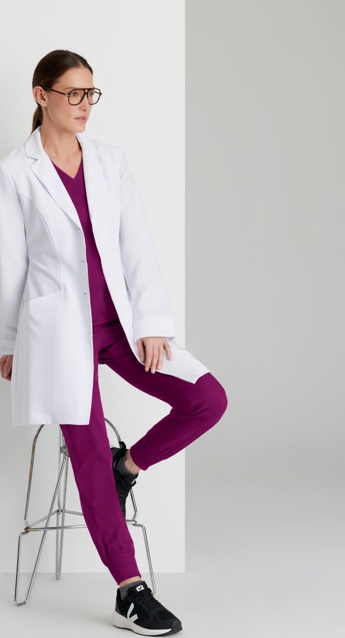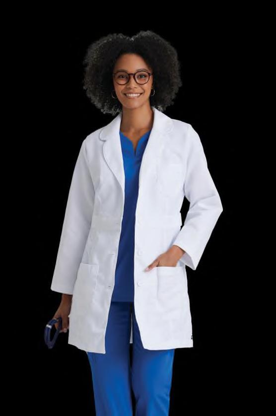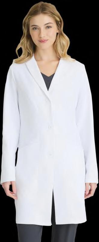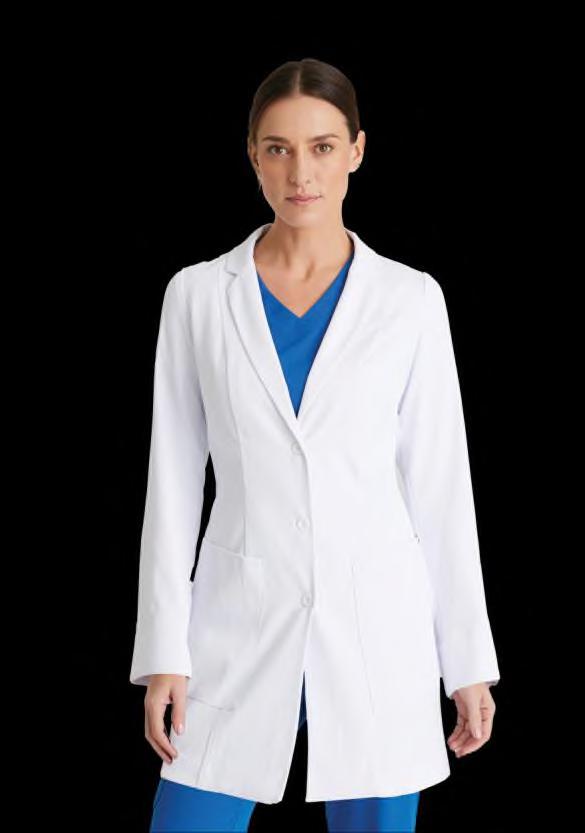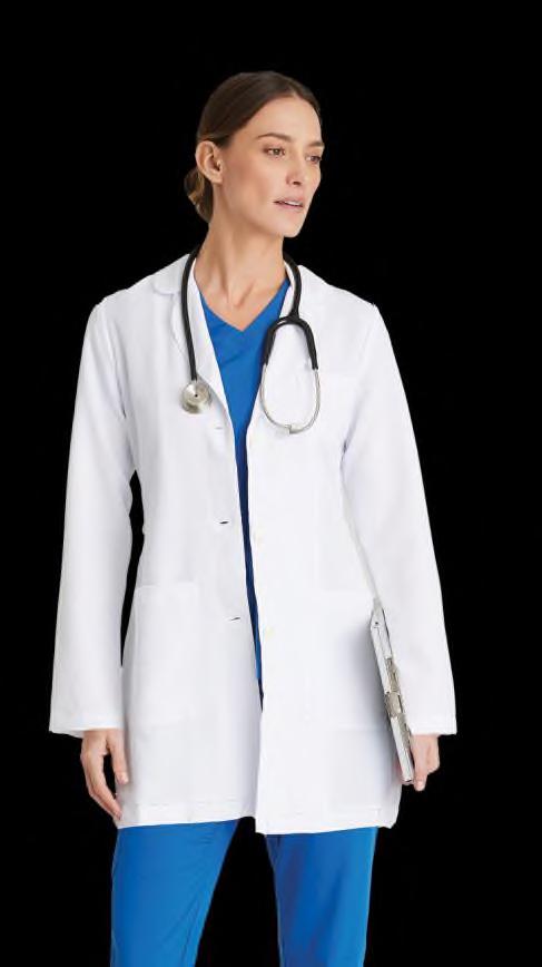 Bata de laboratorio moderna de manga larga con tres bolsillos para mujer, solapa con abertura, costuras princesa en la parte delantera, bolsillos en la cintura con acceso superior aptos para tabletas y ranuras interiores para bolígrafos, abertura central en la espalda, puños con aberturas, lazo para colgar y etiqueta en el bolsillo