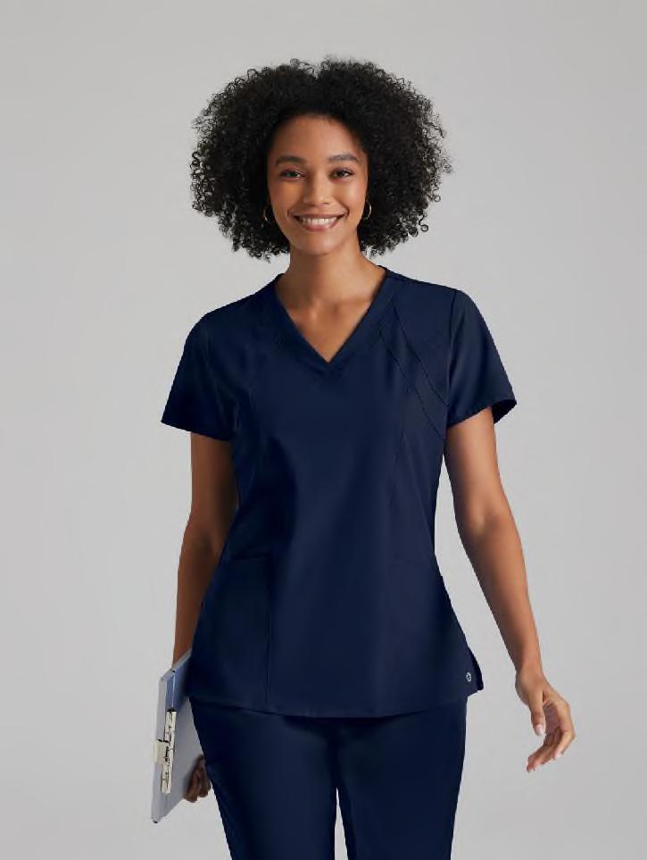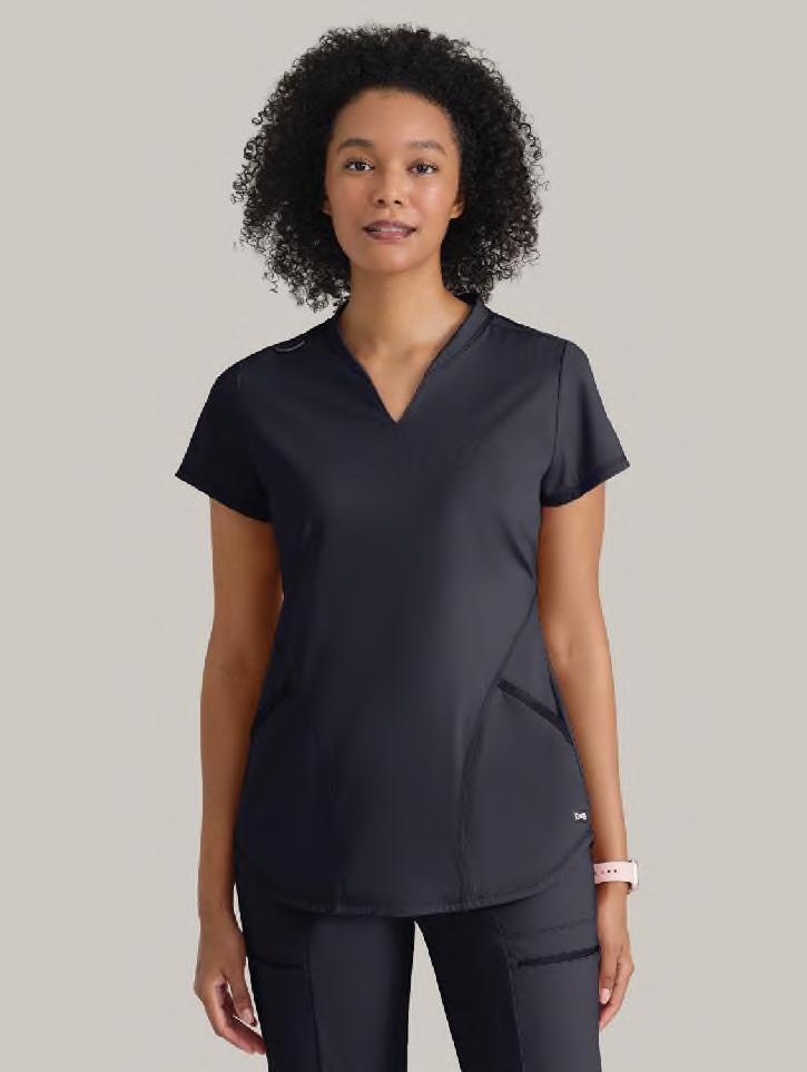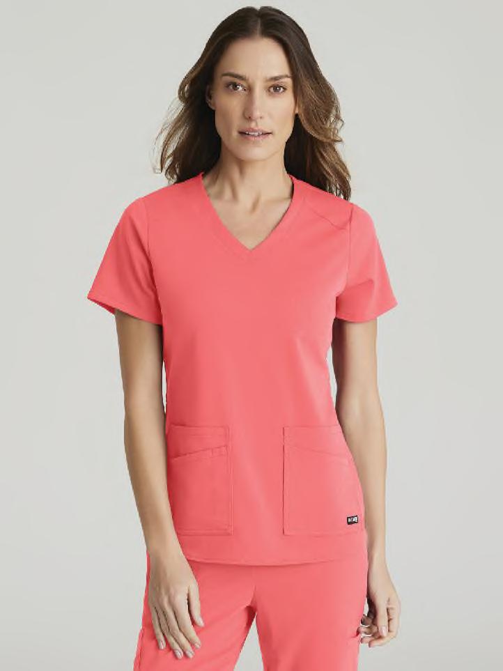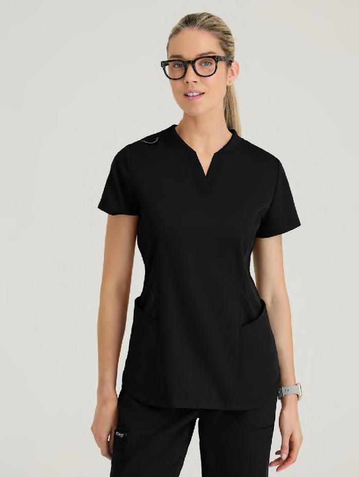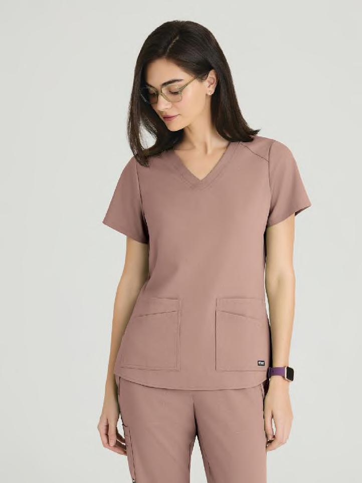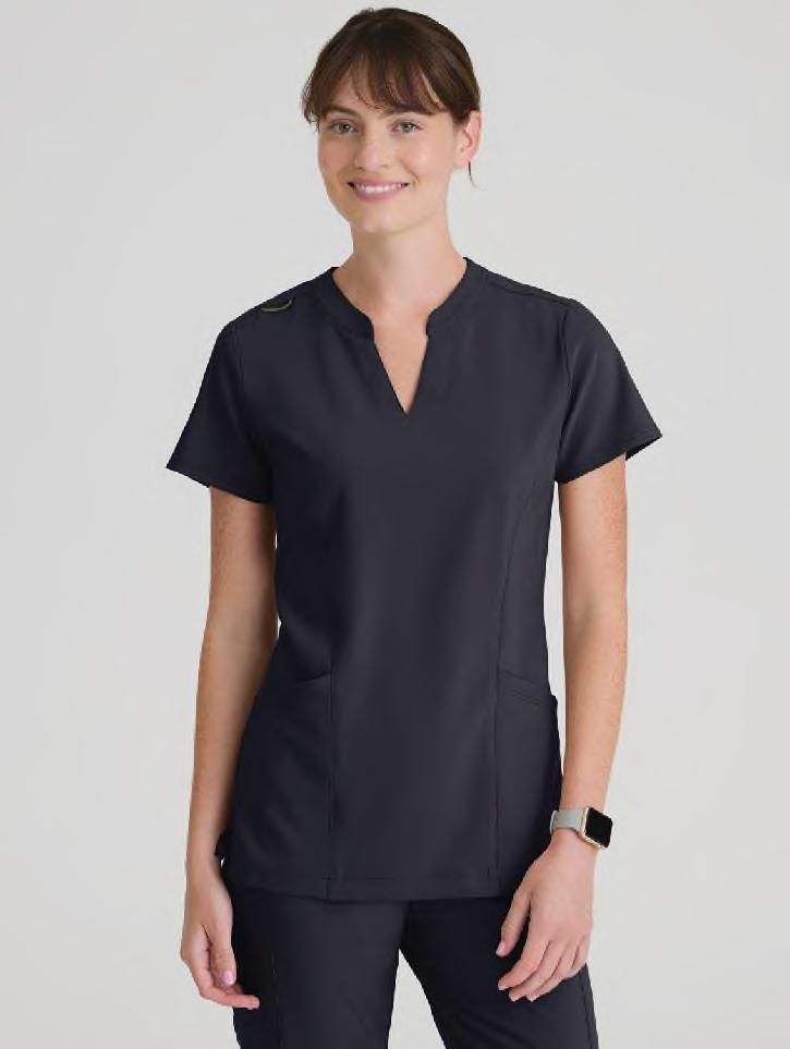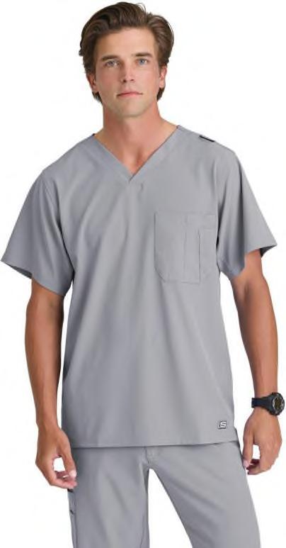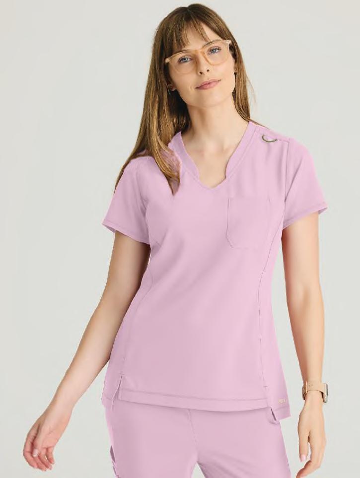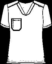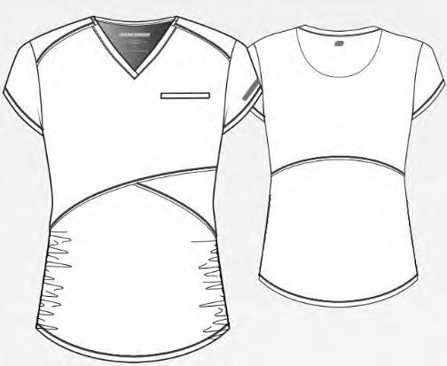 Un bolsillo, cuello en V de punto con insignia gris claro y dobladillo asimétrico