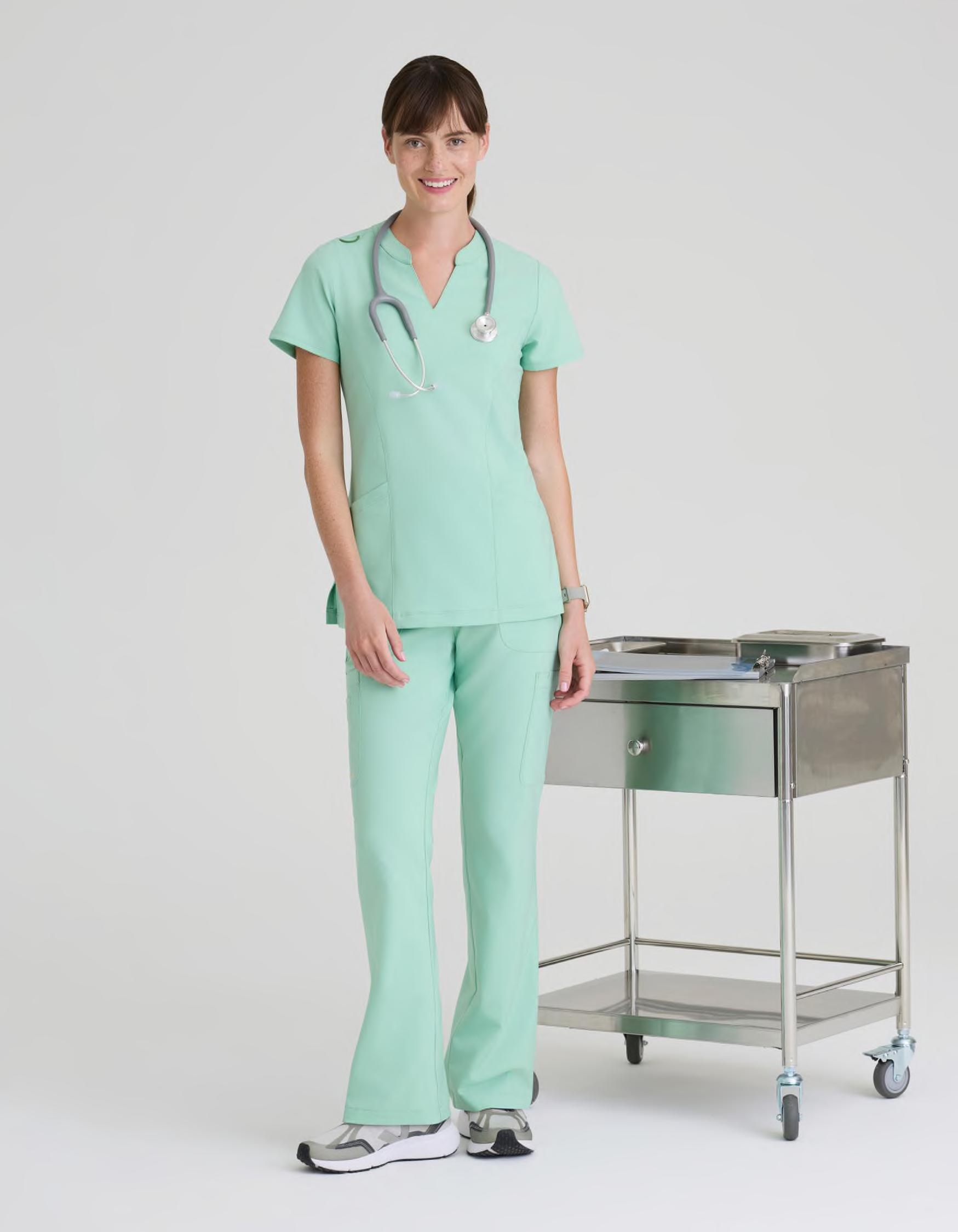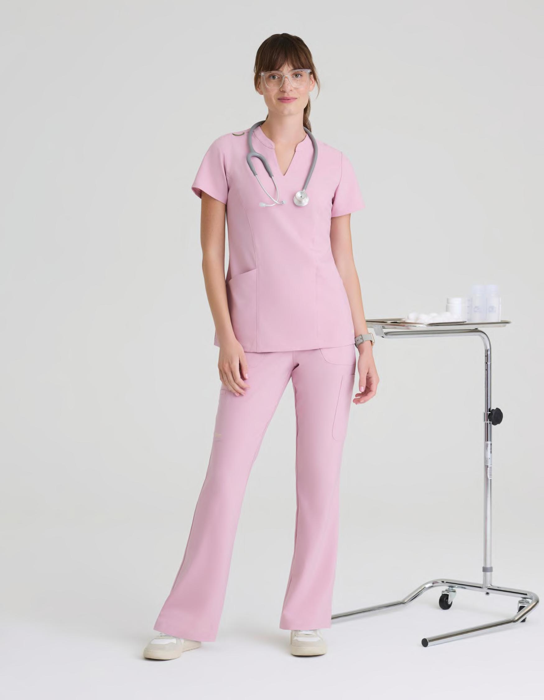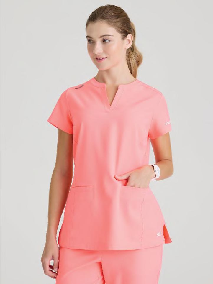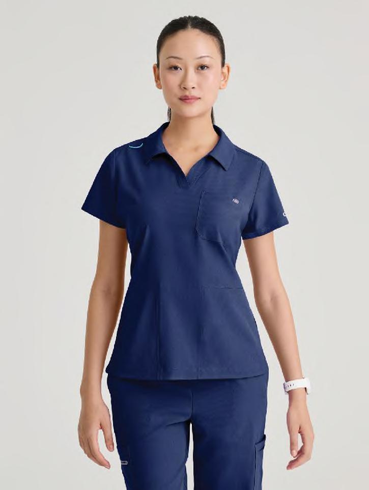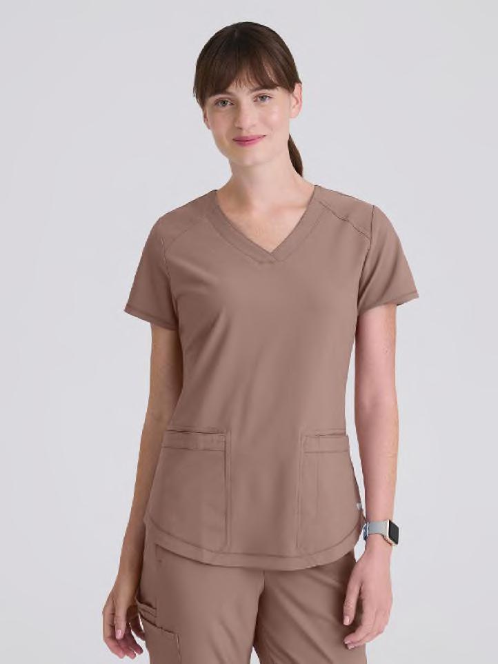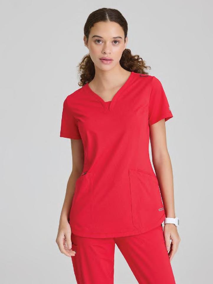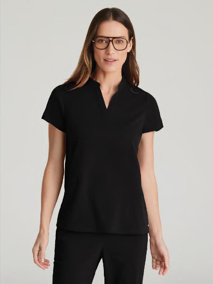 Un bolsillo, cuello en V de punto con insignia gris claro y dobladillo asimétrico