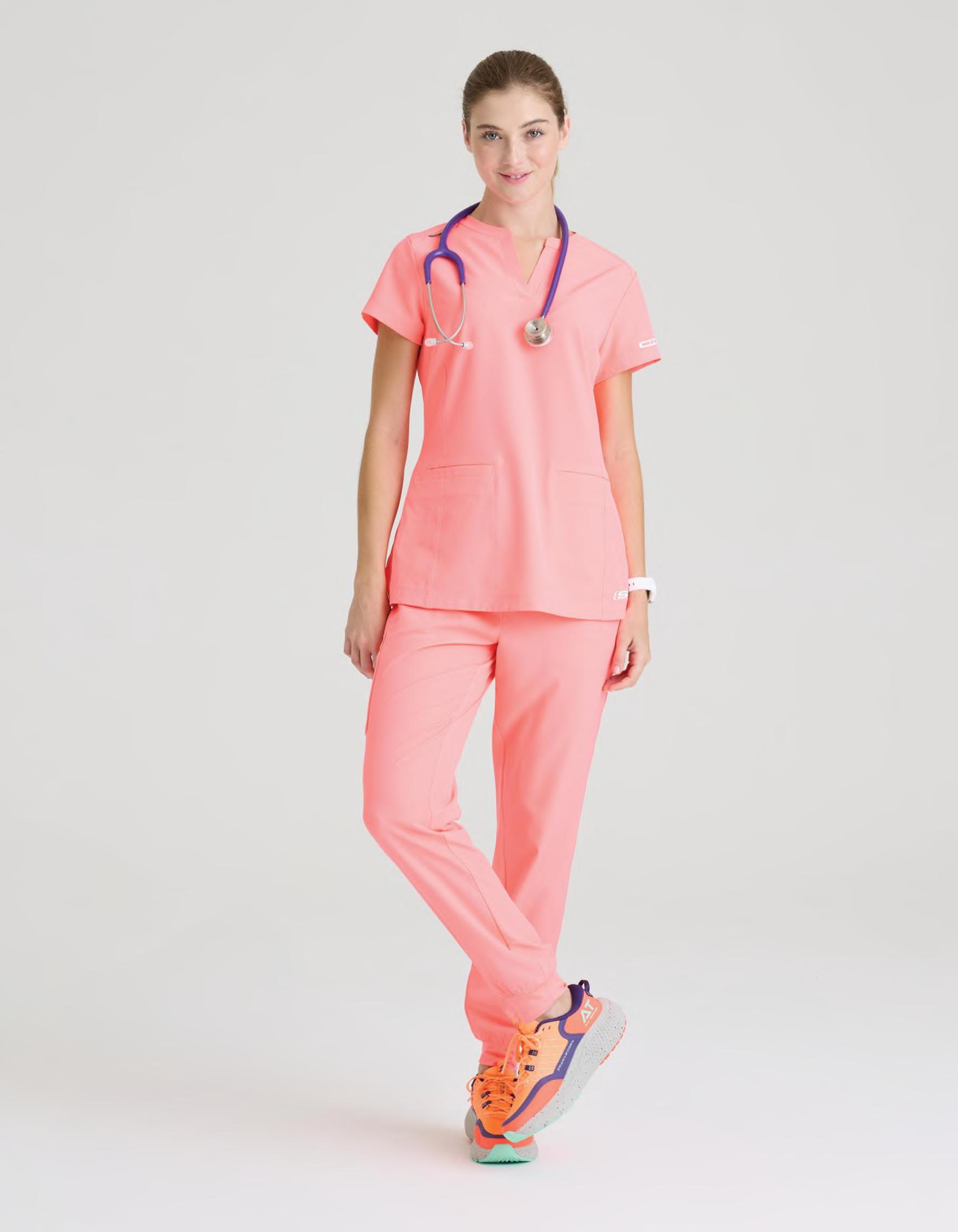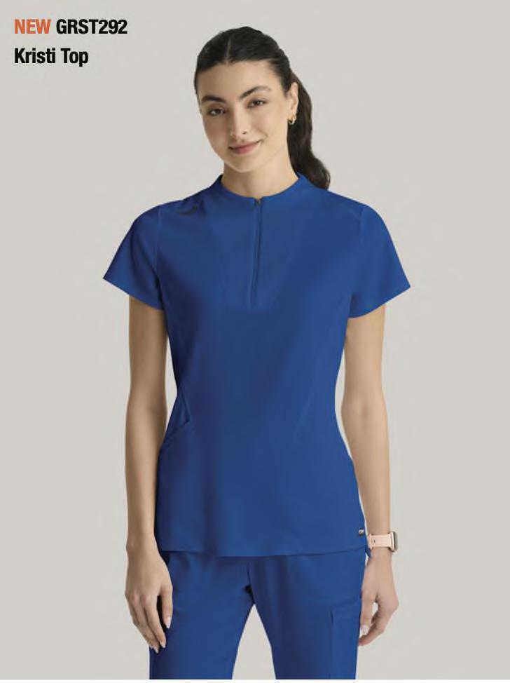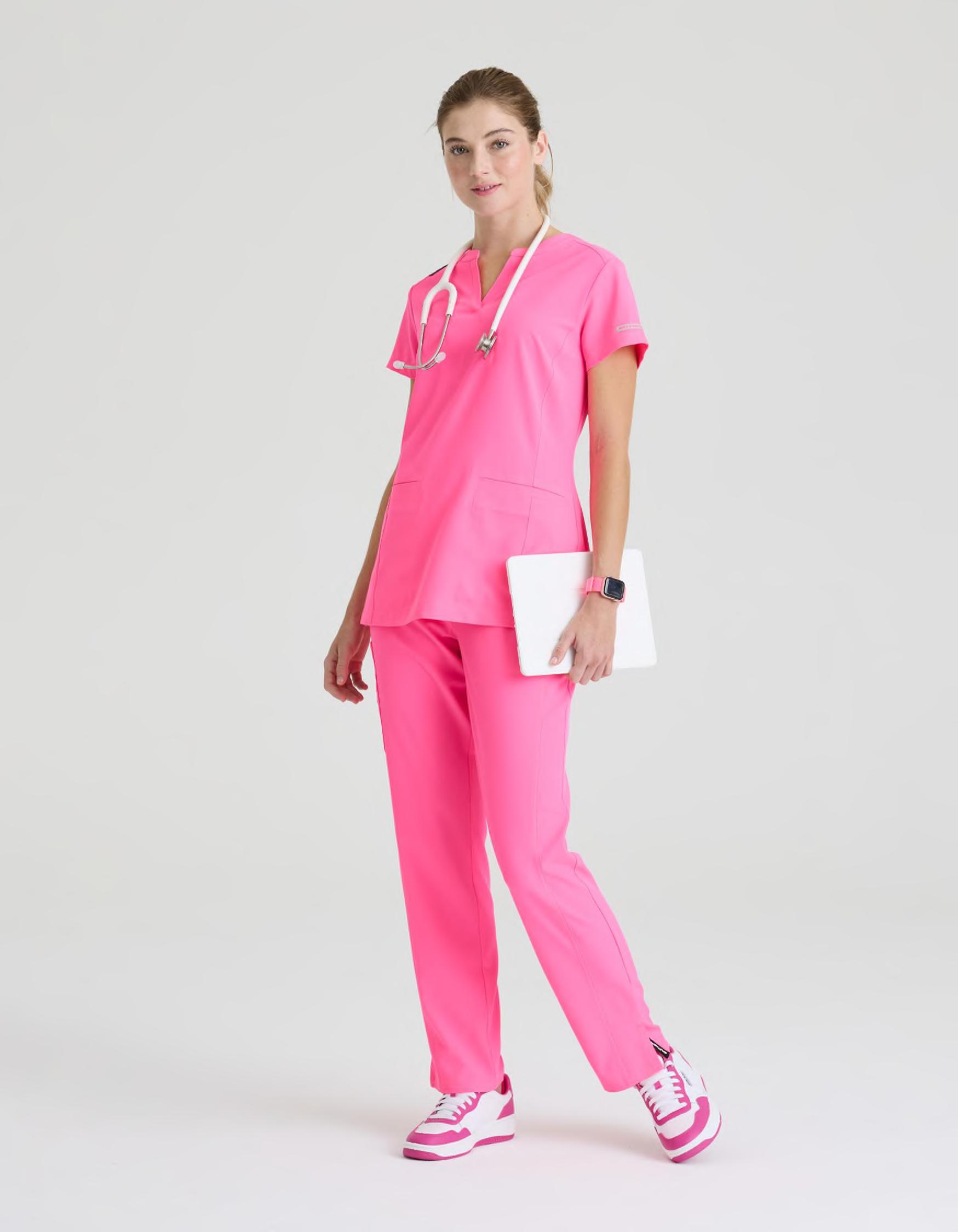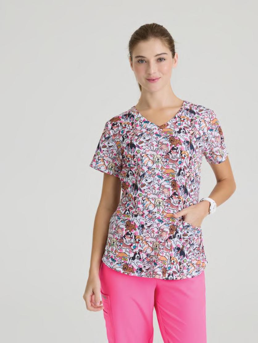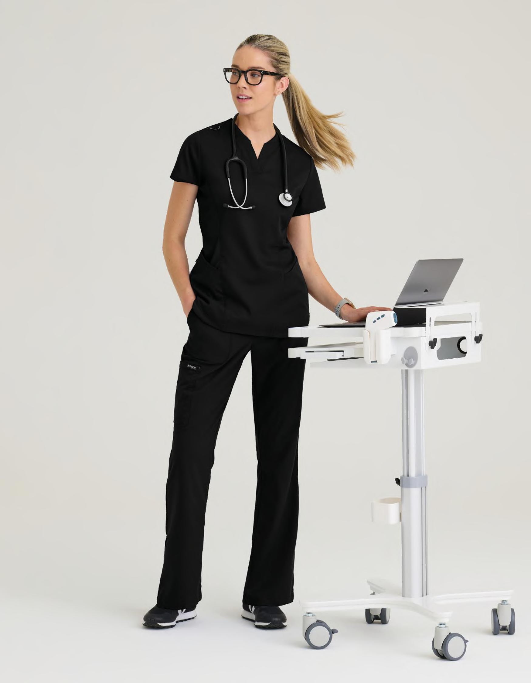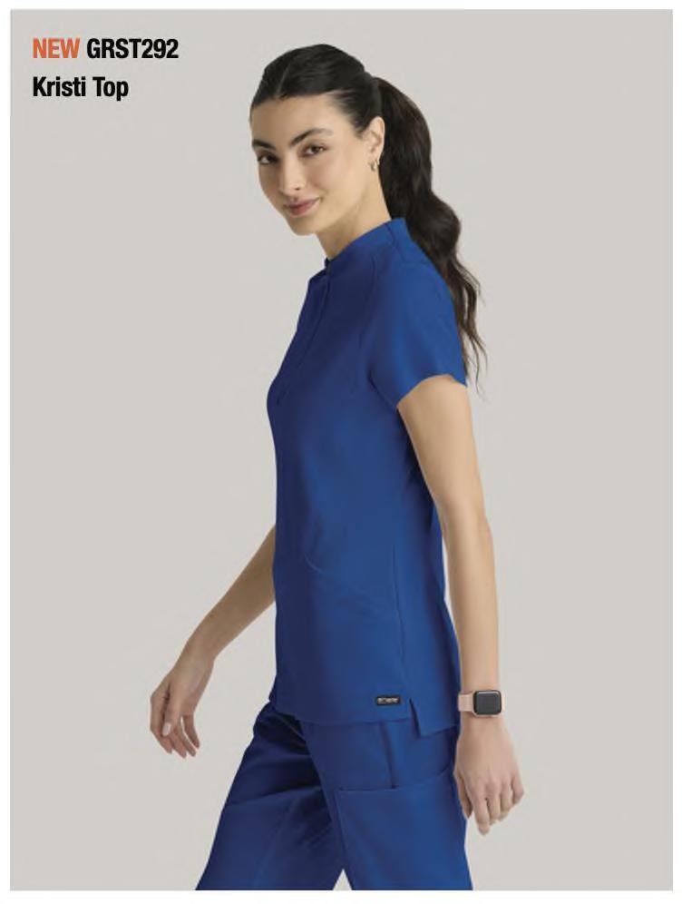 Un bolsillo, cuello en V de punto con insignia gris claro y dobladillo asimétrico