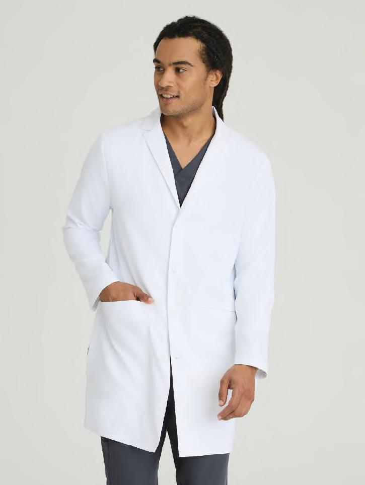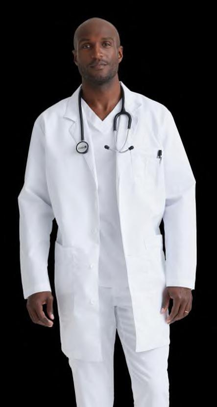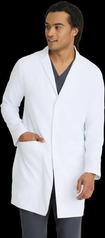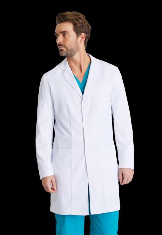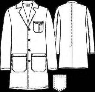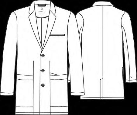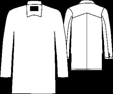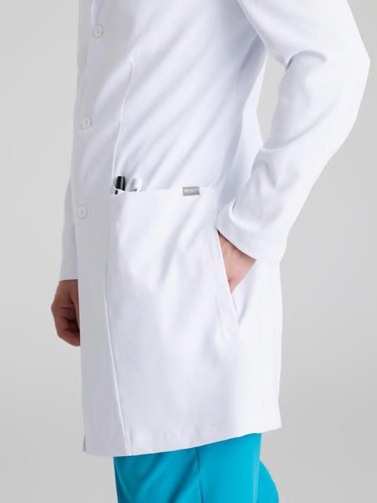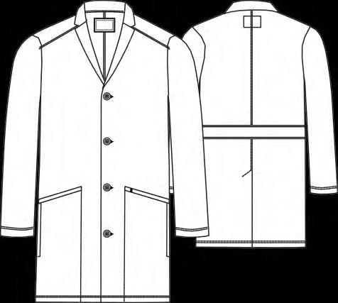 Bata de laboratorio de manga larga con tres bolsillos para hombre, solapa con muesca, bolsillo de pecho con ribete, bolsillos en la cintura con entrada superior aptos para tabletas y ranuras interiores para bolígrafos, abertura central trasera, aberturas en las mangas, aberturas laterales para acceder a los pantalones, presilla para colgar y etiqueta en el bolsillo