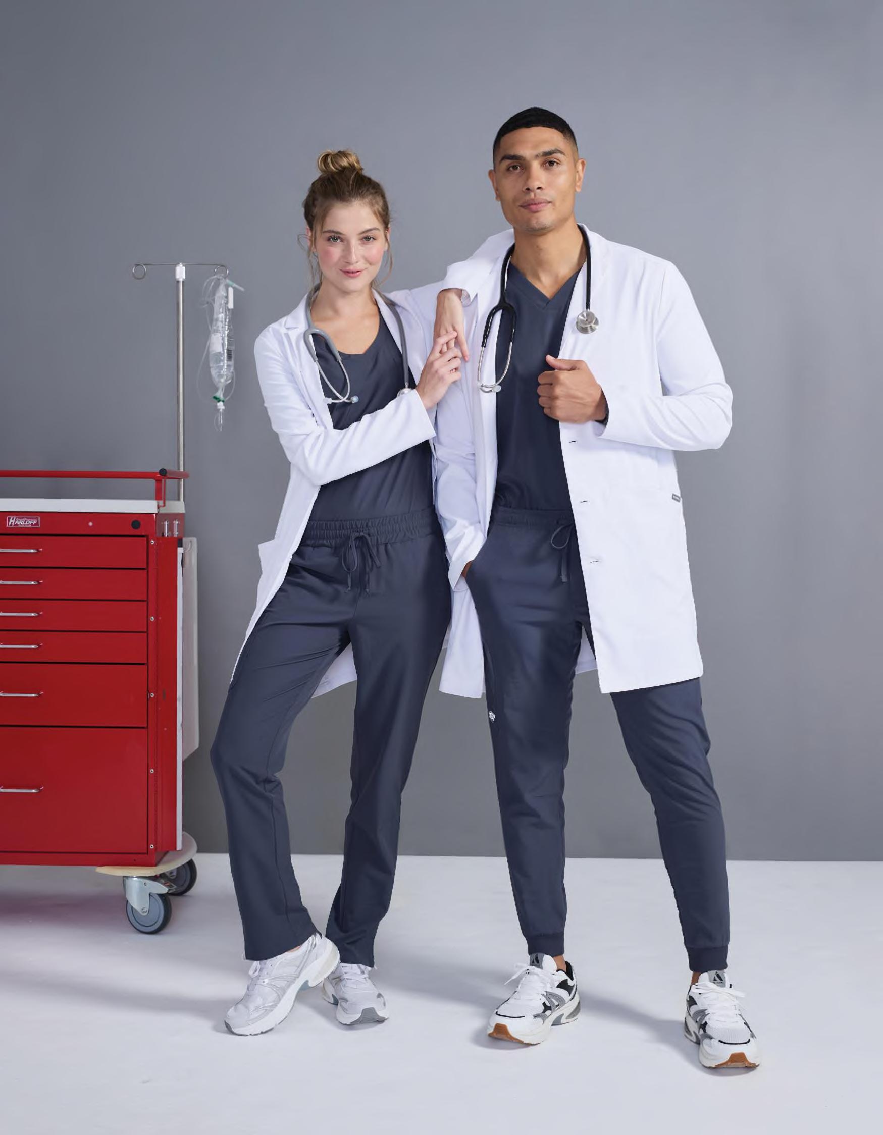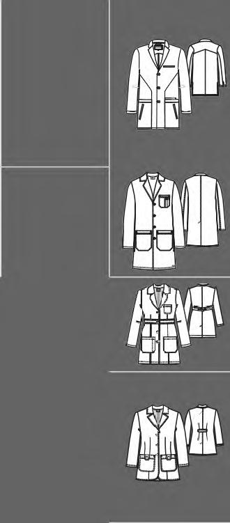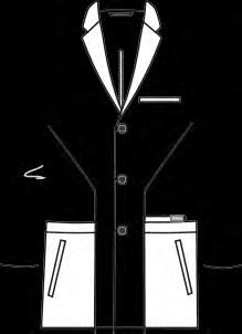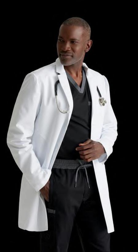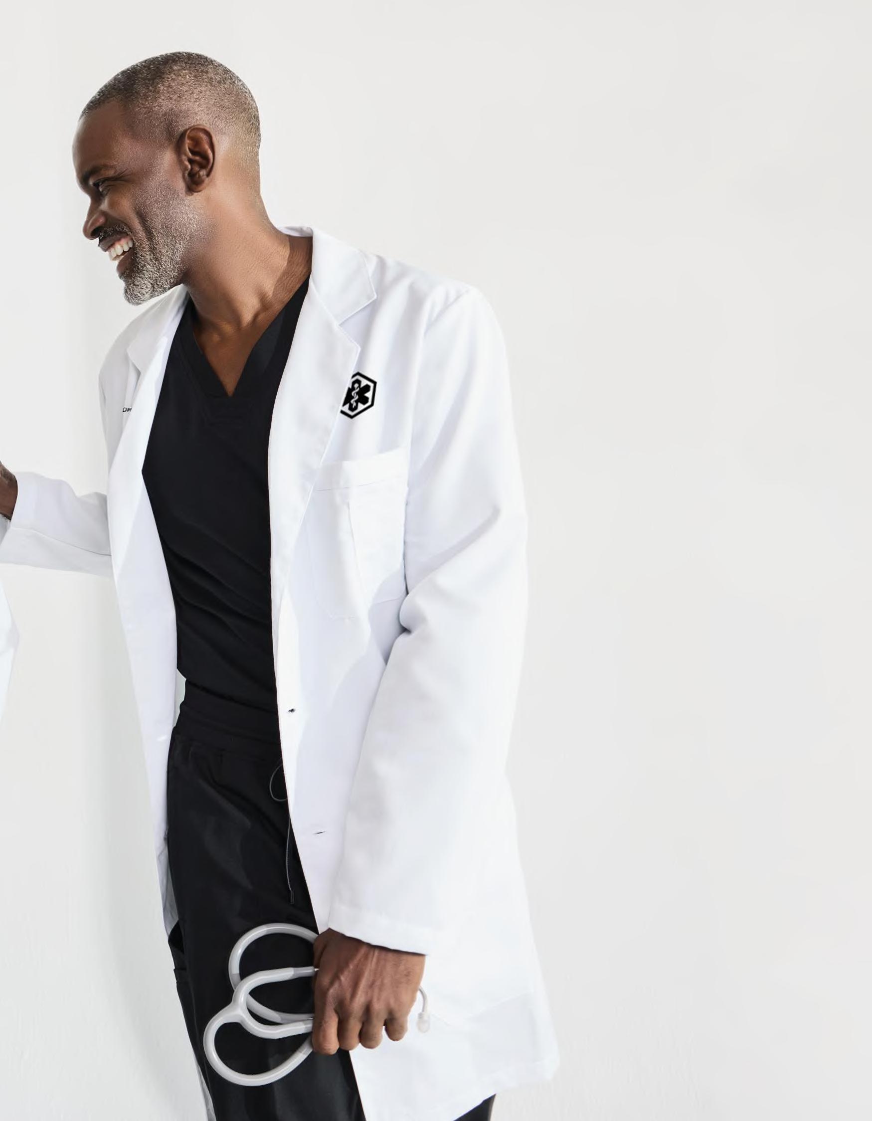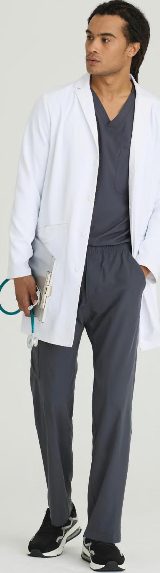 Bata de laboratorio de manga larga con tres bolsillos para hombre, solapa con muesca, bolsillo de pecho con ribete, bolsillos en la cintura con entrada superior aptos para tabletas y ranuras interiores para bolígrafos, abertura central trasera, aberturas en las mangas, aberturas laterales para acceder a los pantalones, presilla para colgar y etiqueta en el bolsillo