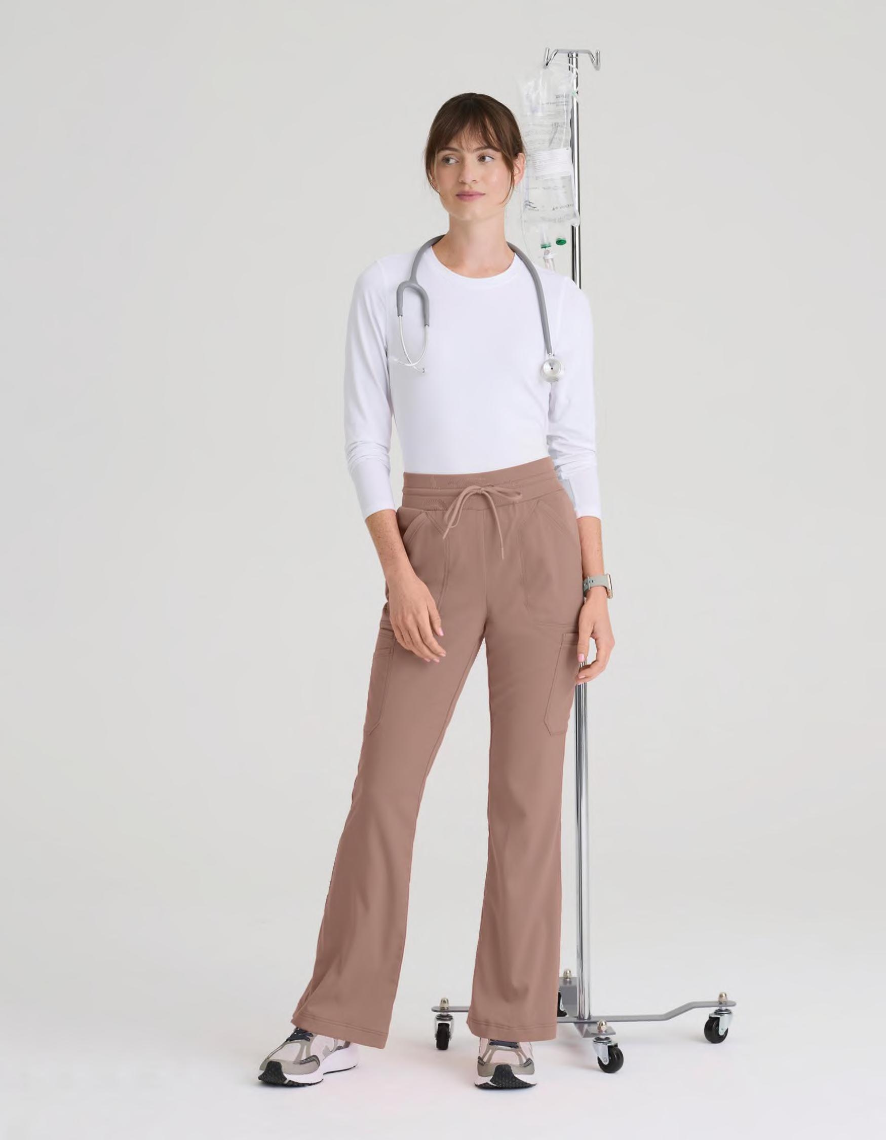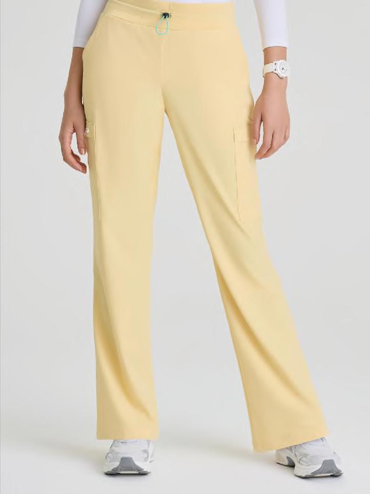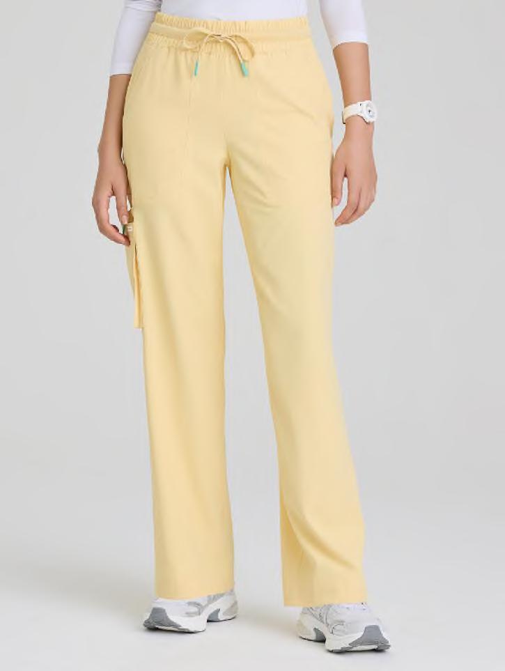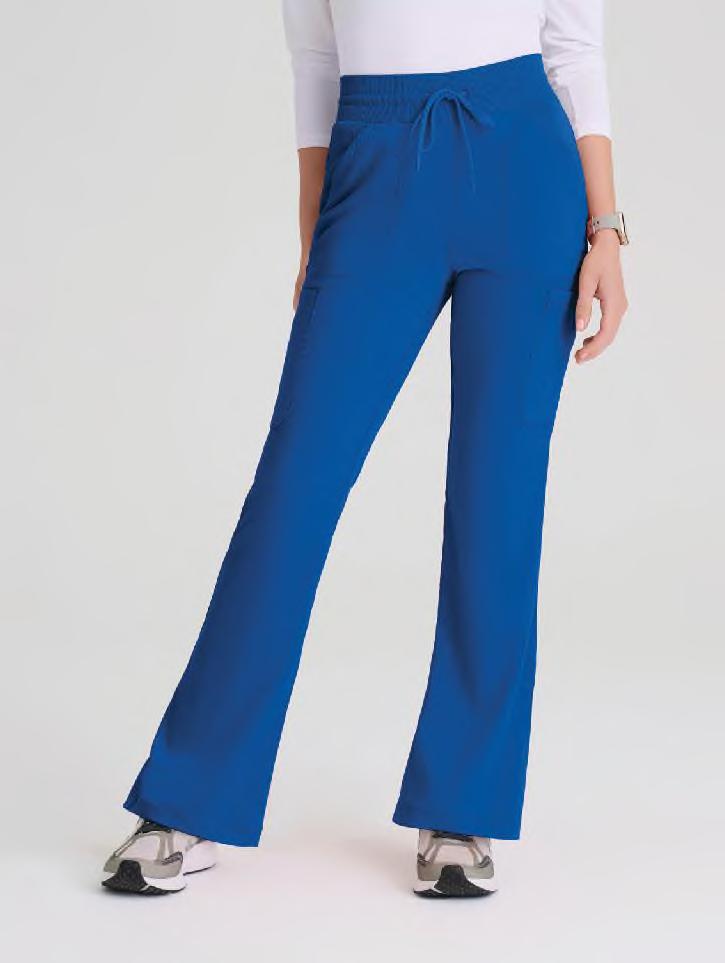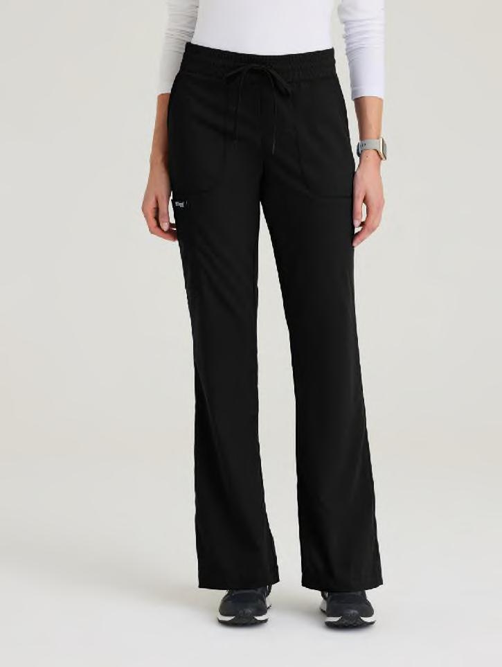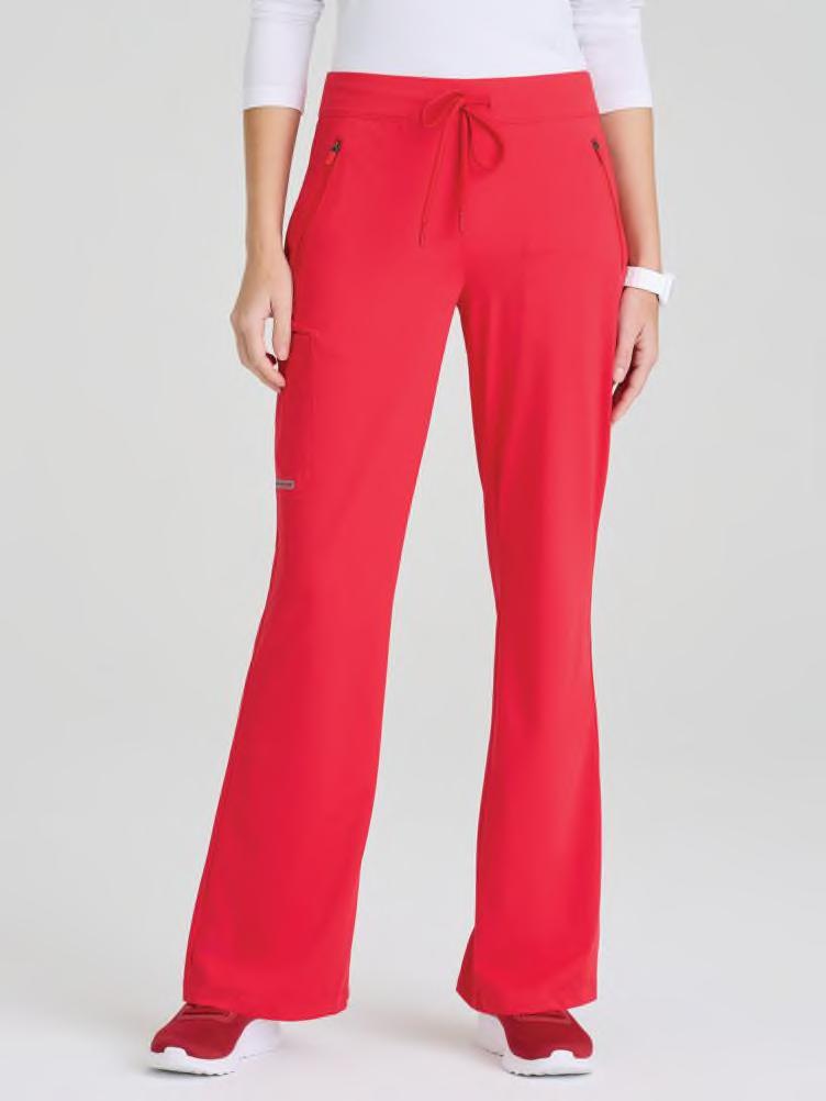 Pantalón de cintura alta con 5 bolsillos, cinturilla plana con cordón interior, lengüetas traseras, bolsillos traseros de parche y pierna recta