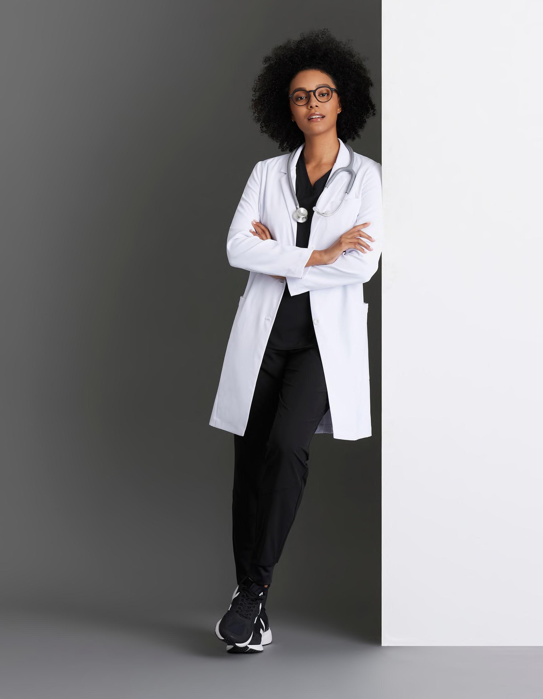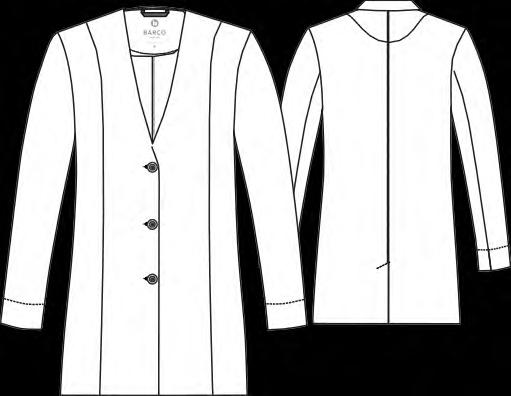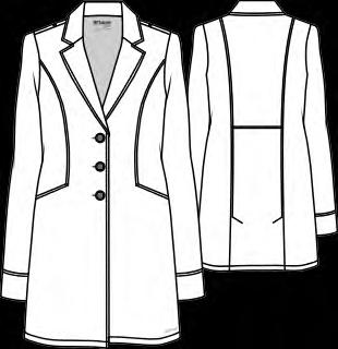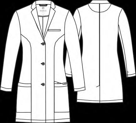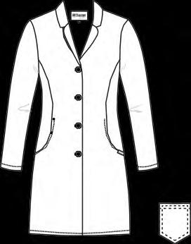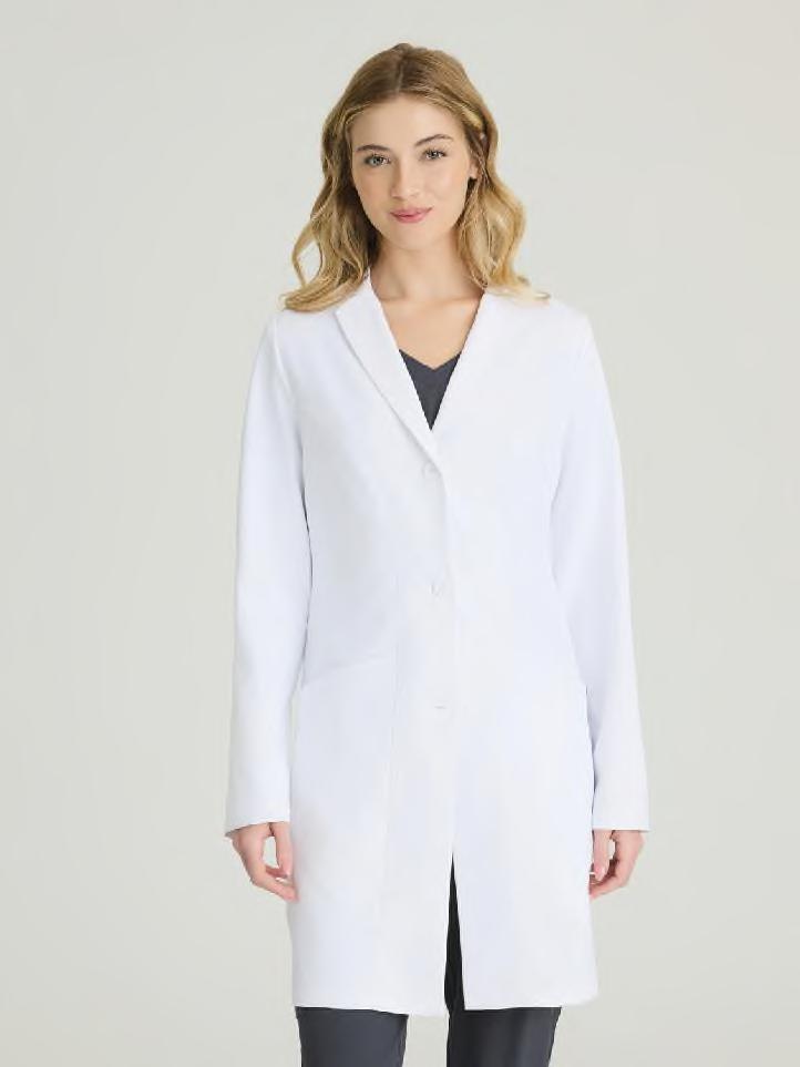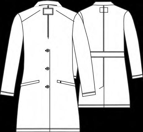 Bata de laboratorio moderna de manga larga con tres bolsillos para mujer, solapa con abertura, costuras princesa curvas en la parte delantera, bolsillo de ojal en el pecho, bolsillos en la cintura con entrada superior, abertura central en la espalda, aberturas en las mangas, lazo para colgar y etiqueta en el bolsillo