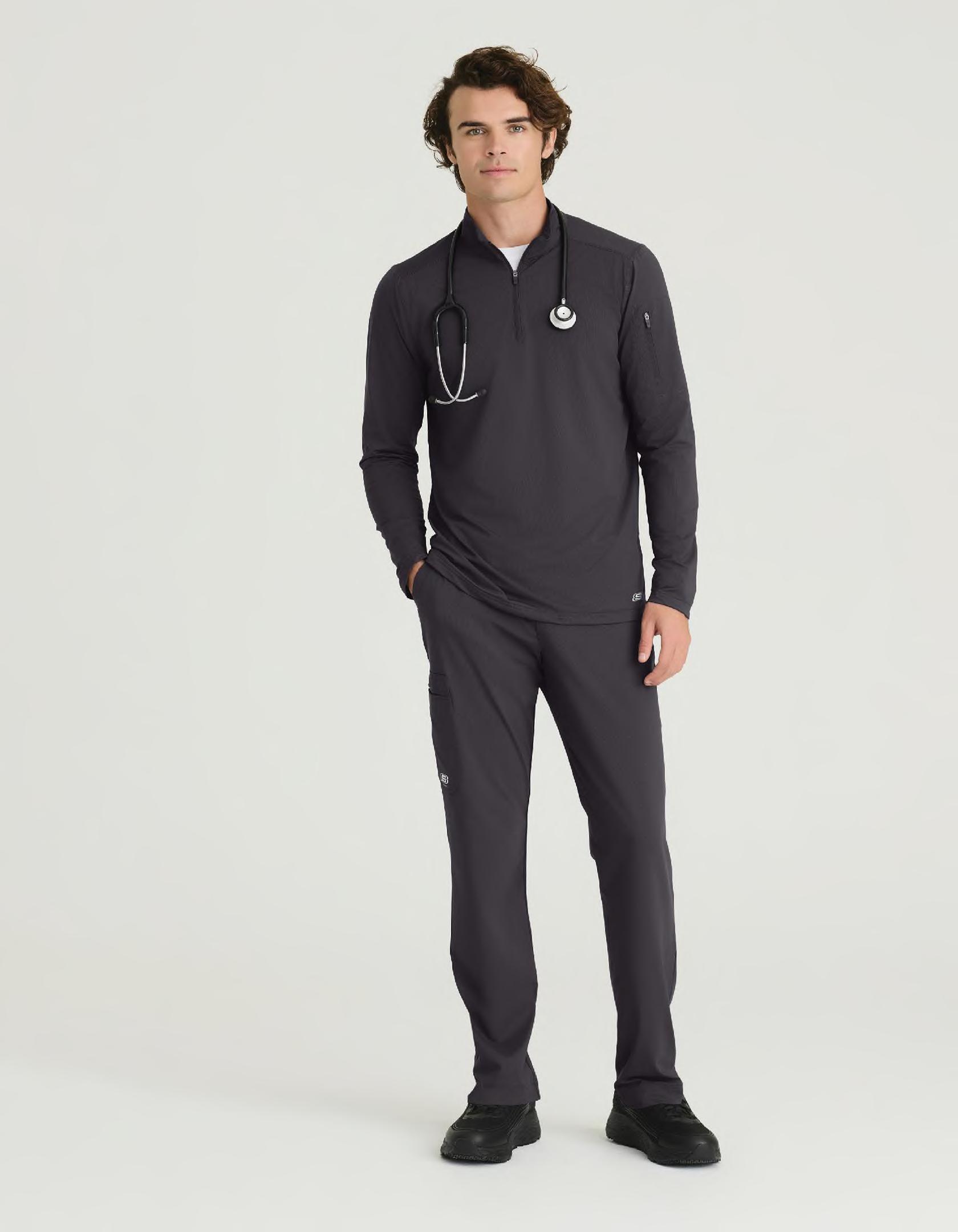 Filipina de hombre de cuello en V con dos bolsillos, presilla para insignia en el hombro derecho, bolsillo con cremallera en el pecho, bolsillo de parche en la manga izquierda y bajo asimétrico con muesca