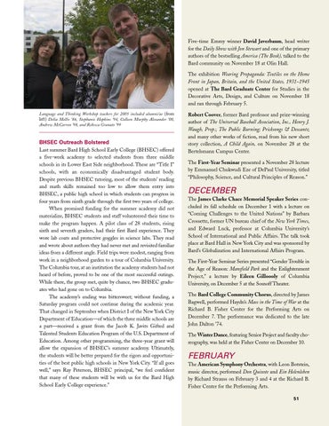 BHSEC Outreach Bolstered Last summer Bard High School Early College (BHSEC) offered a five-week academy to selected students from three middle schools in its Lower East Side neighborhood. These are “Title I” schools, with an economically disadvantaged student body. Despite previous BHSEC tutoring, most of the students’ reading and math skills remained too low to allow them entry into BHSEC, a public high school in which students can progress in four years from ninth grade through the first two years of college. When promised funding for the summer academy did not materialize, BHSEC students and staff volunteered their time to make the program happen. A pilot class of 28 students, rising sixth and seventh graders, had their first Bard experience. They wore lab coats and protective goggles in science labs. They read and wrote about authors they had never met and revisited familiar ideas from a different angle. Field trips were modest, ranging from work in a neighborhood garden to a tour of Columbia University. The Columbia tour, at an institution the academy students had not heard of before, proved to be one of the most successful outings. While there, the group met, quite by chance, two BHSEC graduates who had gone on to Columbia. The academy’s ending was bittersweet; without funding, a Saturday program could not continue during the academic year. That changed in September when District I of the New York City Department of Education—of which the three middle schools are a part—received a grant from the Jacob K. Javits Gifted and Talented Students Education Program of the U.S. Department of Education. Among other programming, the three-year grant will allow the expansion of BHSEC’s summer academy. Ultimately, the students will be better prepared for the rigors and opportunities of the best public high schools in New York City. “If all goes well,” says Ray Peterson, BHSEC principal, “we feel confident that many of these students will be with us for the Bard High School Early College experience.”