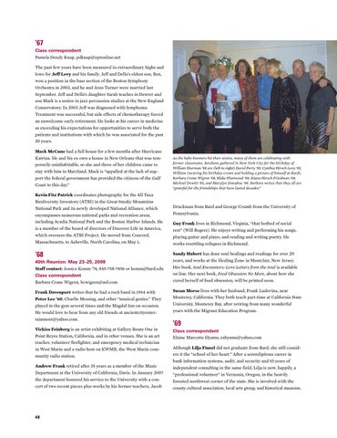 Class correspondent Barbara Crane Wigren, bcwigren@aol.com Frank Davenport writes that he had a rock band in 1964 with Peter Lee ’60, Charlie Messing, and other “musical genies.” They played in the gym several times and the Magdal Inn on occasion. He would love to hear from any old friends at ancientcityentertainment@yahoo.com. Vickisa Feinberg is an artist exhibiting at Gallery Route One in Point Reyes Station, California, and in other venues. She is an art teacher, volunteer firefighter, and emergency medical technician in West Marin and a radio host on KWMR, the West Marin community radio station. Andrew Frank retired after 35 years as a member of the Music Department at the University of California, Davis. In January 2007 the department honored his service to the University with a concert of two recent pieces plus works by his former teachers, Jacob
